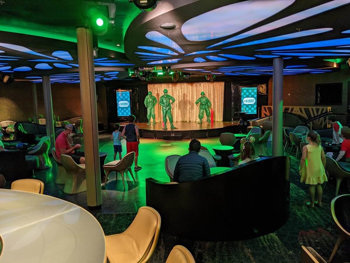 “C’mon, Dad, let me enjoy my chocolate chip pancakes without a photo.” But check out that beautiful blue ocean in the background. After our top deck breakfast we stopped by the Sarge Says (Simon Says Disney style) activity and the tween hangout Edge had an Open House. I’m grateful Disney has a space for younger teens as well as Vibe for the older ones.