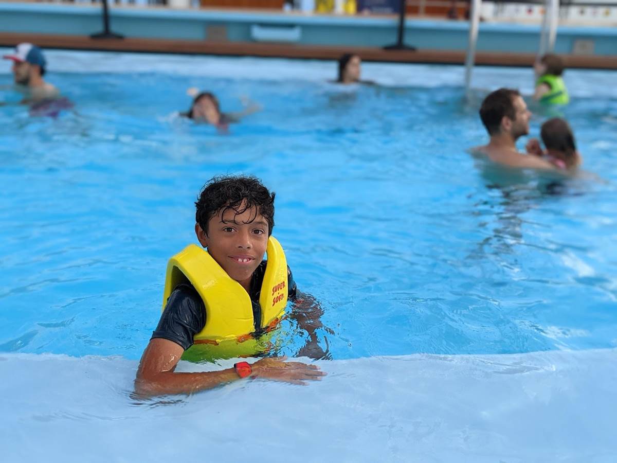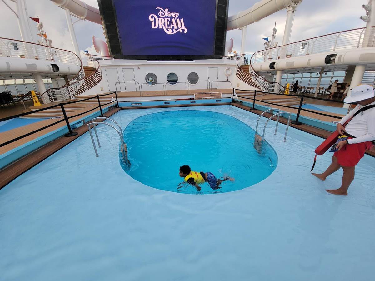 We stayed long enough at the pool that most guests were either at the show or their early dining so Gideon enjoyed swimming laps around the Donald Pool.