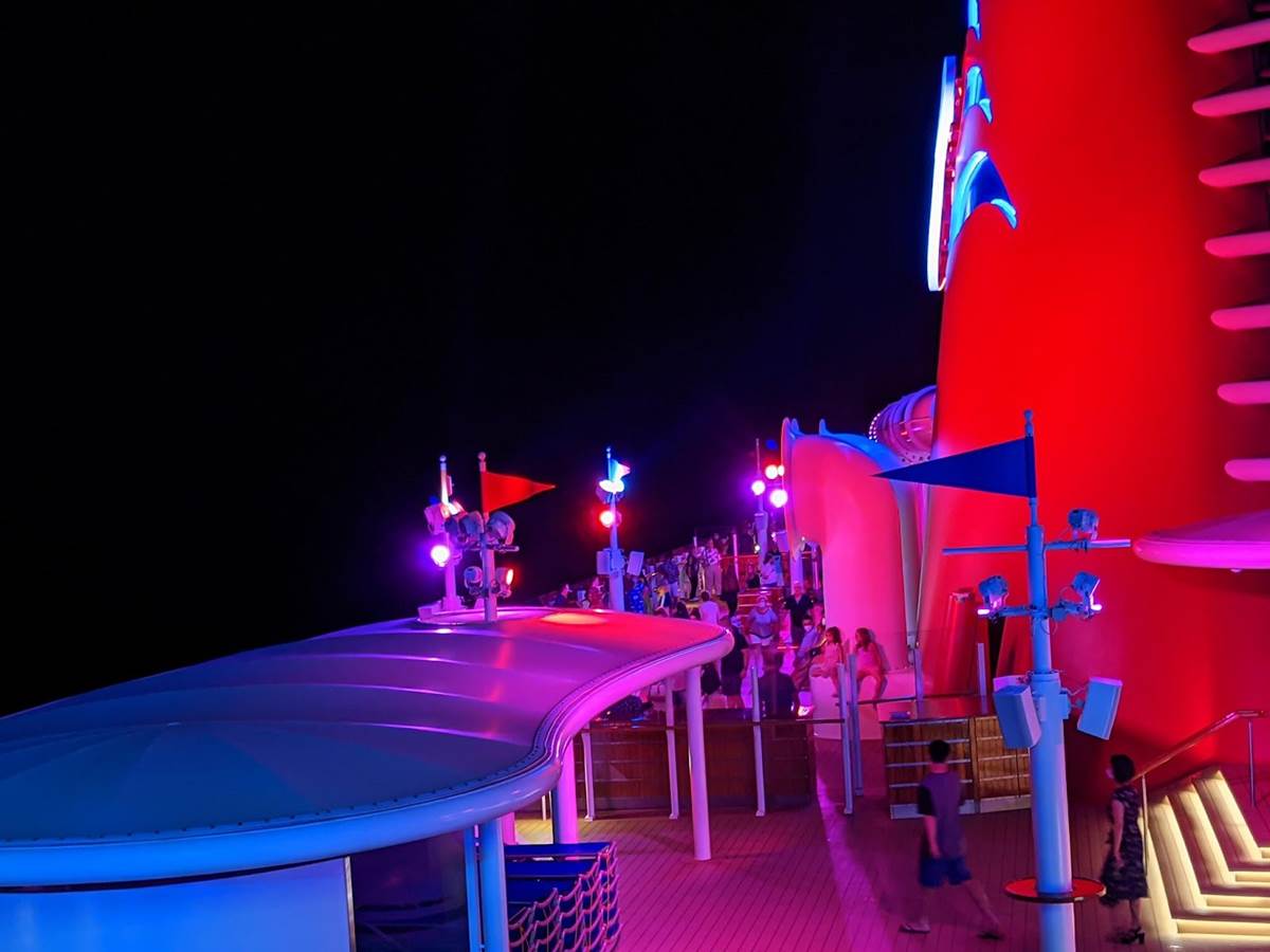 As we continued to stroll we soon discovered that it was nearly time for the first presentation of Disney Ever After, the new Disney Cruise Line fireworks presentation. The show would be presented over two nights to ensure opportunity to view while social distancing. The first evening presentation was intended for the early dining and the second evening for the late dining. Glancing around the upper deck there were still plenty of markers open for viewing so we found a place and enjoyed the new show’s public debut.