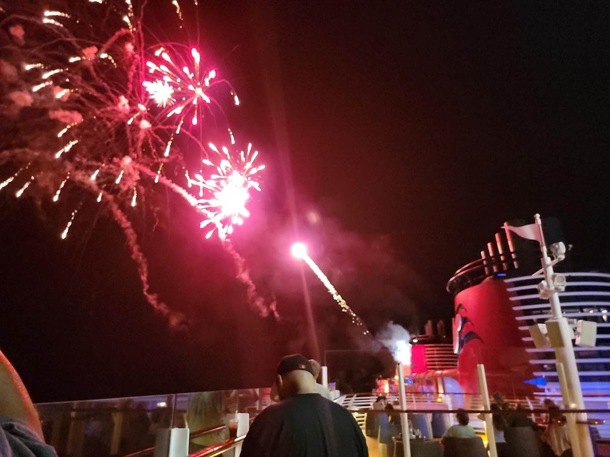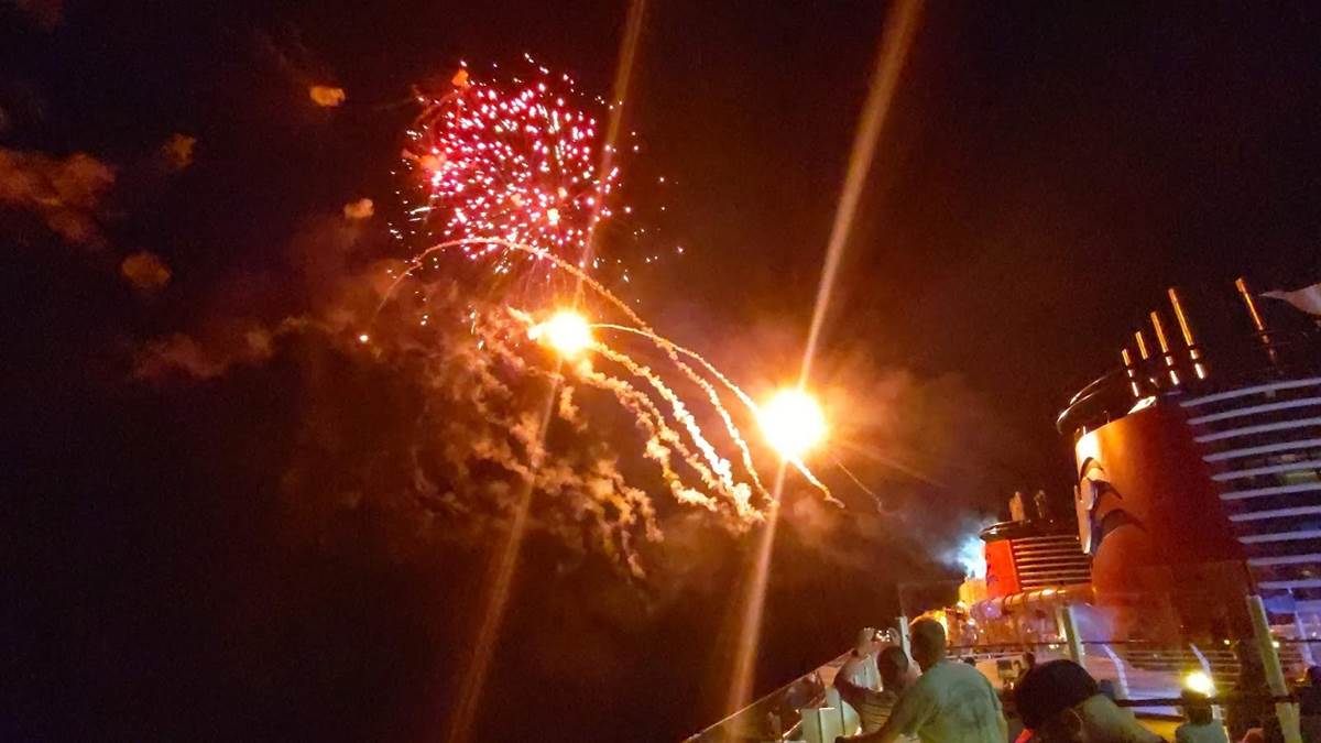Brightly colored fireworks launched from the starboard aft area as an arranged medley of songs - You Can Fly, How Far I’ll Go, Whole New World and When You Wish Upon a Star played.