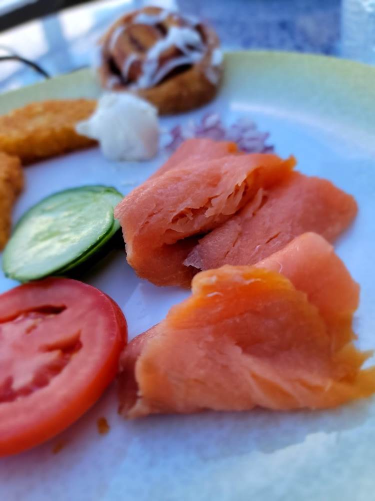 My go-to cruise breakfast at Cabanas is smoked salmon, cucumber, red onions, tomatoes and cream cheese paired with a couple of hash browns and cinnamon rolls.