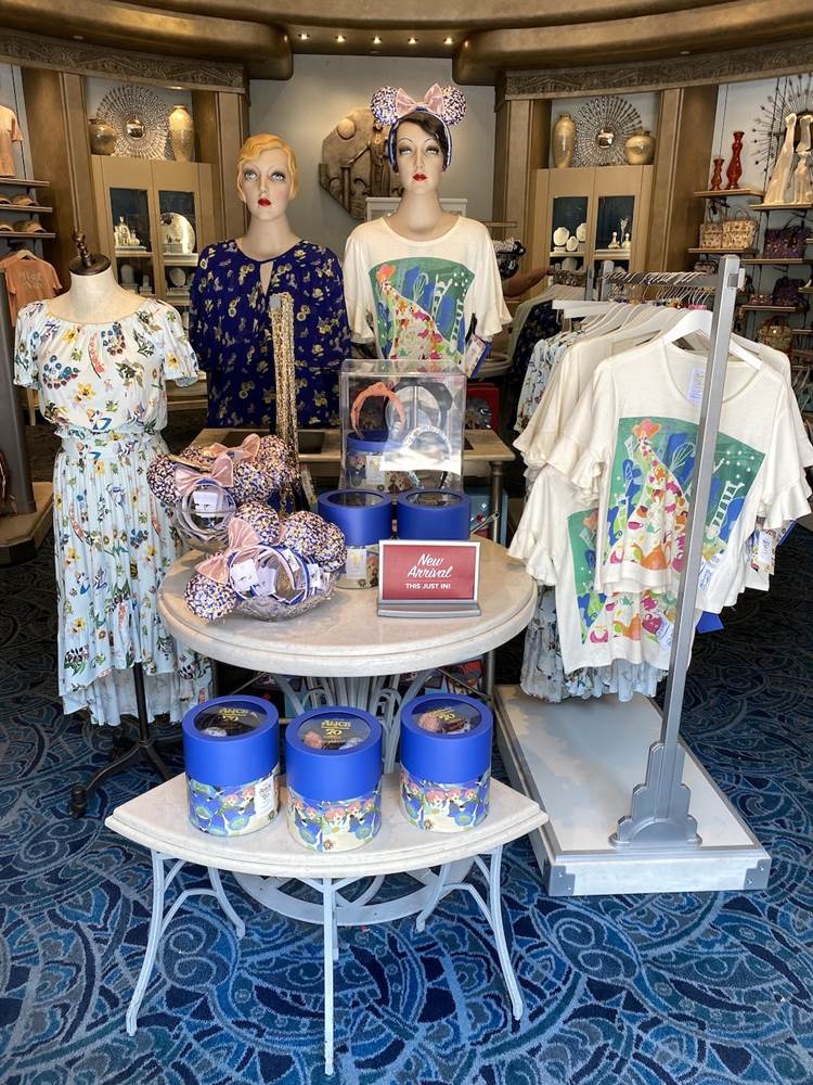 Her Universe collaborated with Disney to bring this collection to guests designing a gorgeous light blue top and skirt set and a navy keyhole blouse that’s decorated with wildflowers. There’s also a pair of pink and blue Minnie Ears topped with a metallic pink bow!