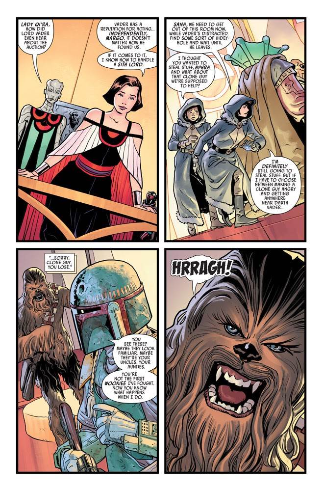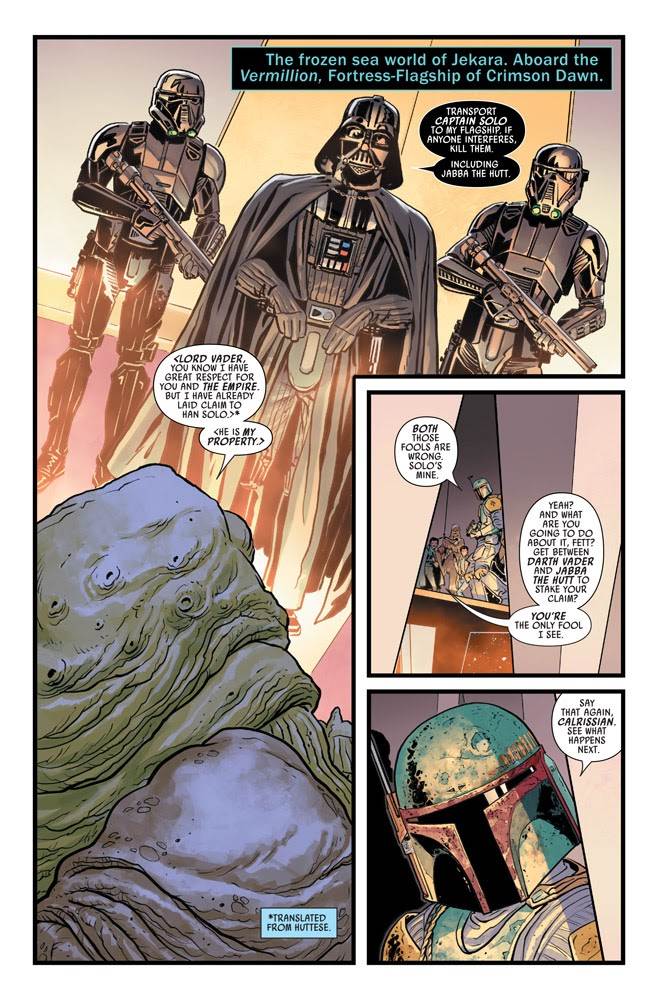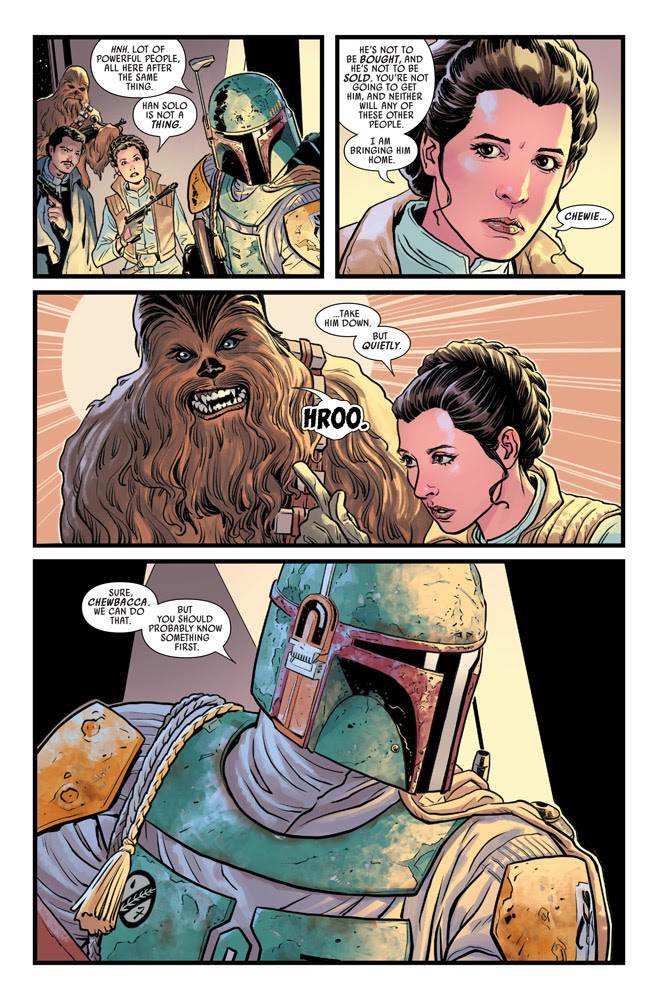 Sith Lord Darth Vader is the real focus of this issue, and we get to see the aftermath of his arrival on Jekara. Vader commandeers that famous carbonite block from Jabba the Hutt, who purchased it from Qi’ra as the highest bidder. Naturally the Hutts are not too thrilled with that idea, but as they attempt to negotiate with the Imperial forces, hidden away behind the scenes bounty hunter Boba Fett is having his own confrontation with Rebel Alliance members Leia Organa and Chewbacca, alongside their fence-sitting scoundrel companion Lando Calrissian.