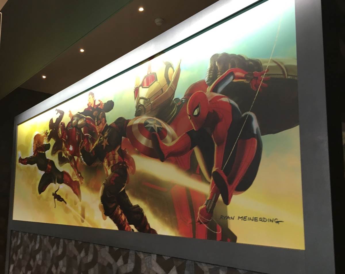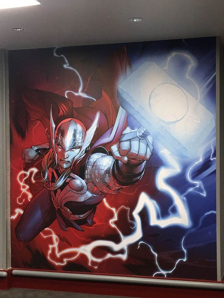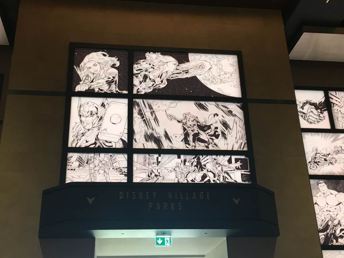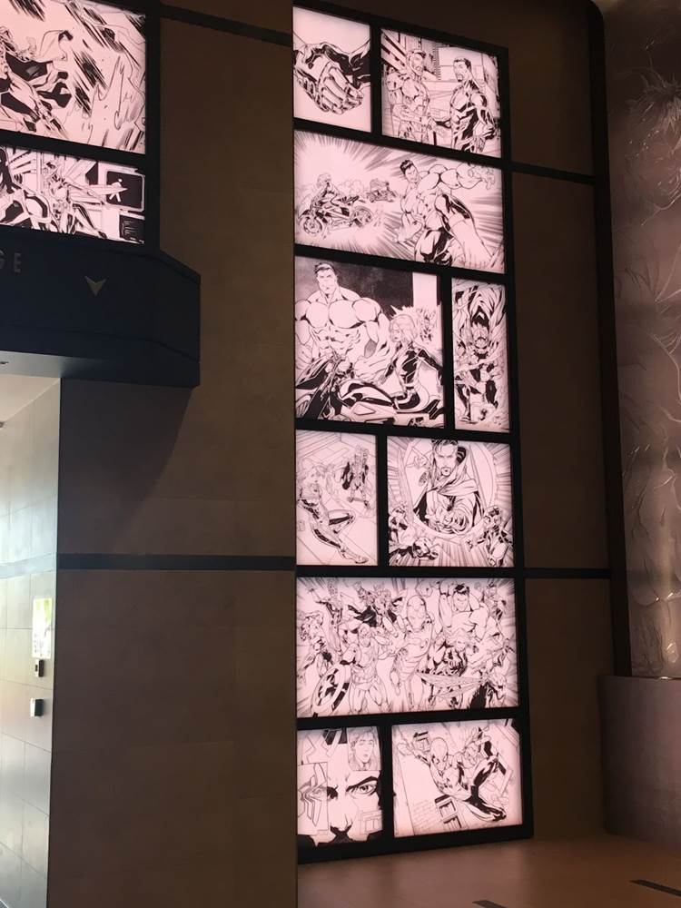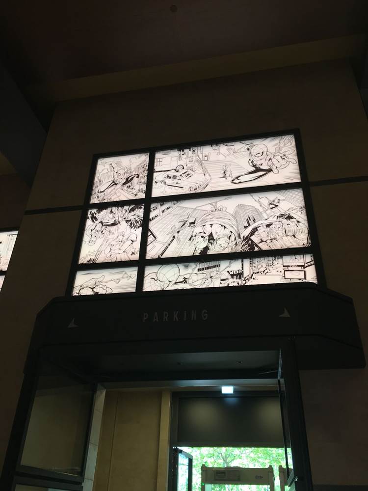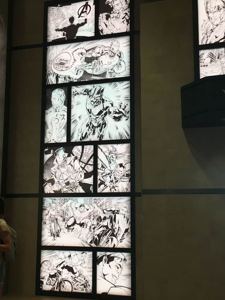 The backlit drawings around both entrances might seem like random artwork, but they’re both actually a cohesive comic book strip. Tony Stark needs help and calls his fellow Avengers in the first set, but Spiderman is noticeably absent. If you look at the strips on the other entrance, you’ll see that Spiderman was busy helping the citizens of New York. These panels were all created without speech bubbles or text so that guests can create their own dialogue.