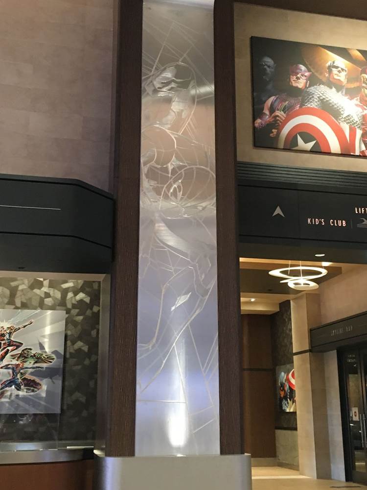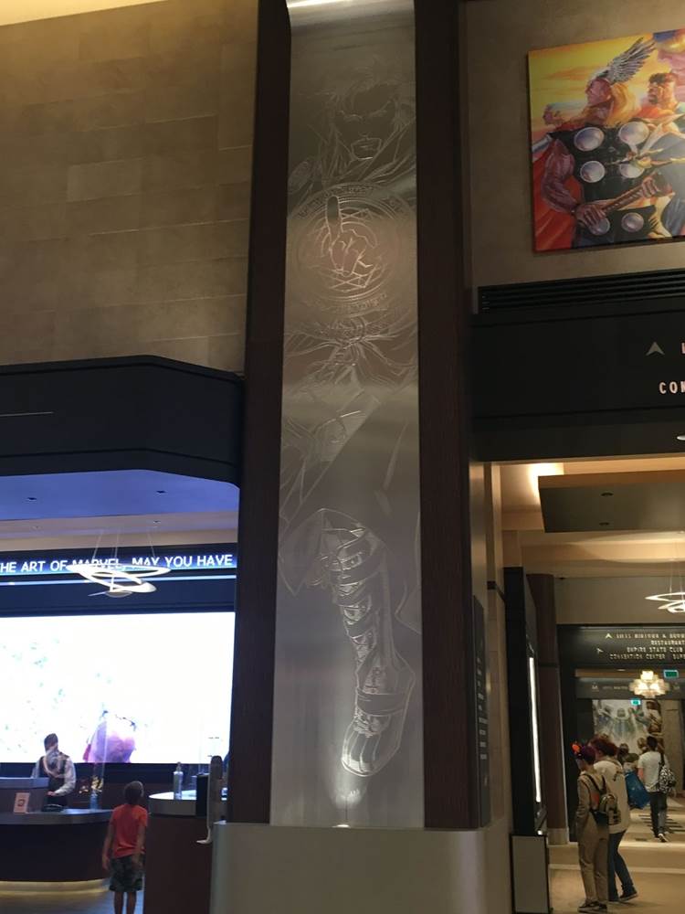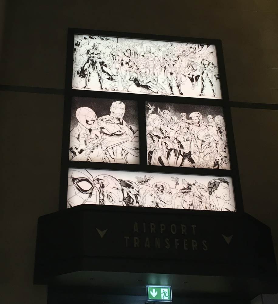 Behind the hotels reception are giant screens showing the creation of a piece called “Marvel Saves The Big Apple” by South Korean artist Kim Jung Gi. This absolutely massive scene depicts the heroes saving the citizens of New York - but other everyday heroes such as the firefighters are also highlighted. This artwork took Kim Jung Gi only 2 days to complete and was freehanded entirely. The finished piece can be viewed in the hotel’s convention center.