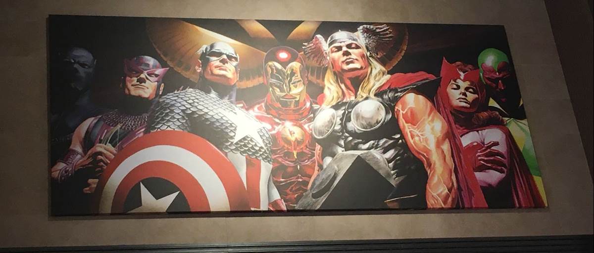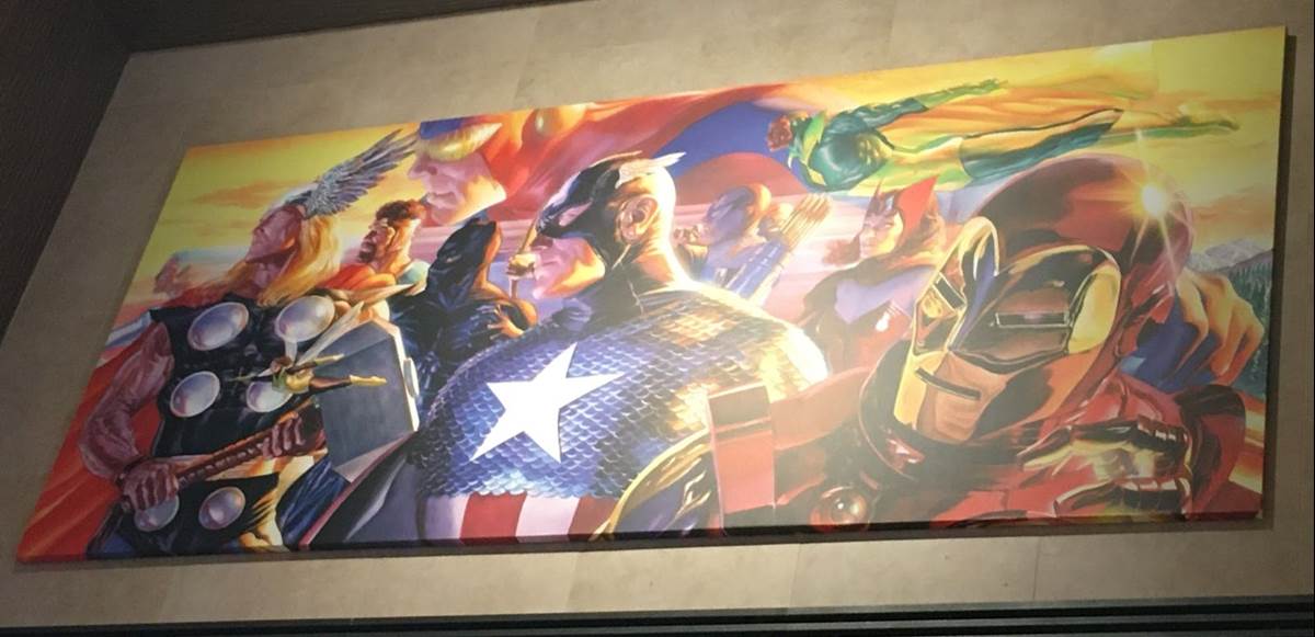 Above the separate wing entrances, we can see two pieces by American artist Alex Roos - “Avengers Assemble” And “Invincible”. These hyper realistic paintings first depict the Avengers in their classic comic book style costumes, and introduce Goliath in the background - as well as Scarlet Witch and living android Vision.
