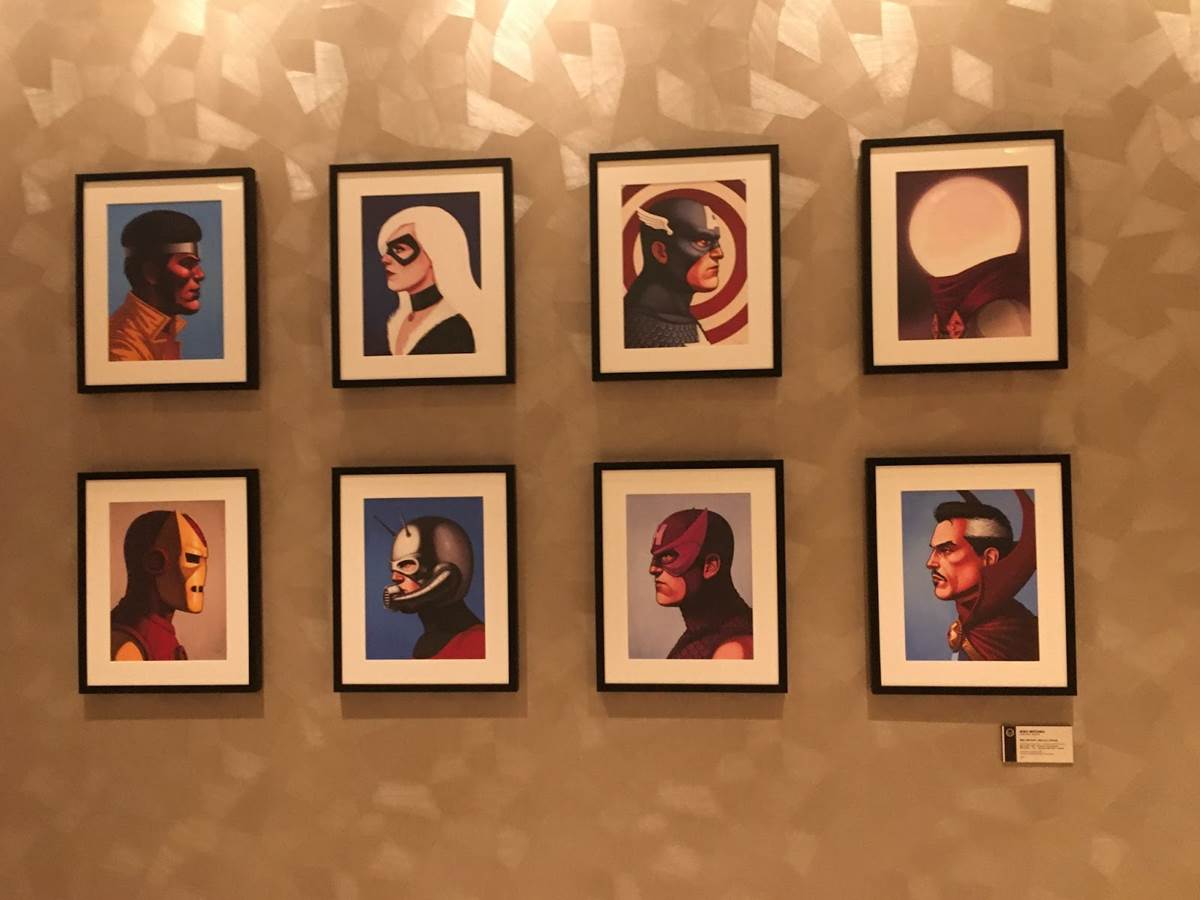 Two collections of portraits line the walls further down the hallway, featuring a host of Marvel characters in a side view position - with Deadpool being the only one facing head on. These pieces were created by artist Mike Mitchell in 2014 and are displayed at the hotel courtesy of Mondo Gallery.