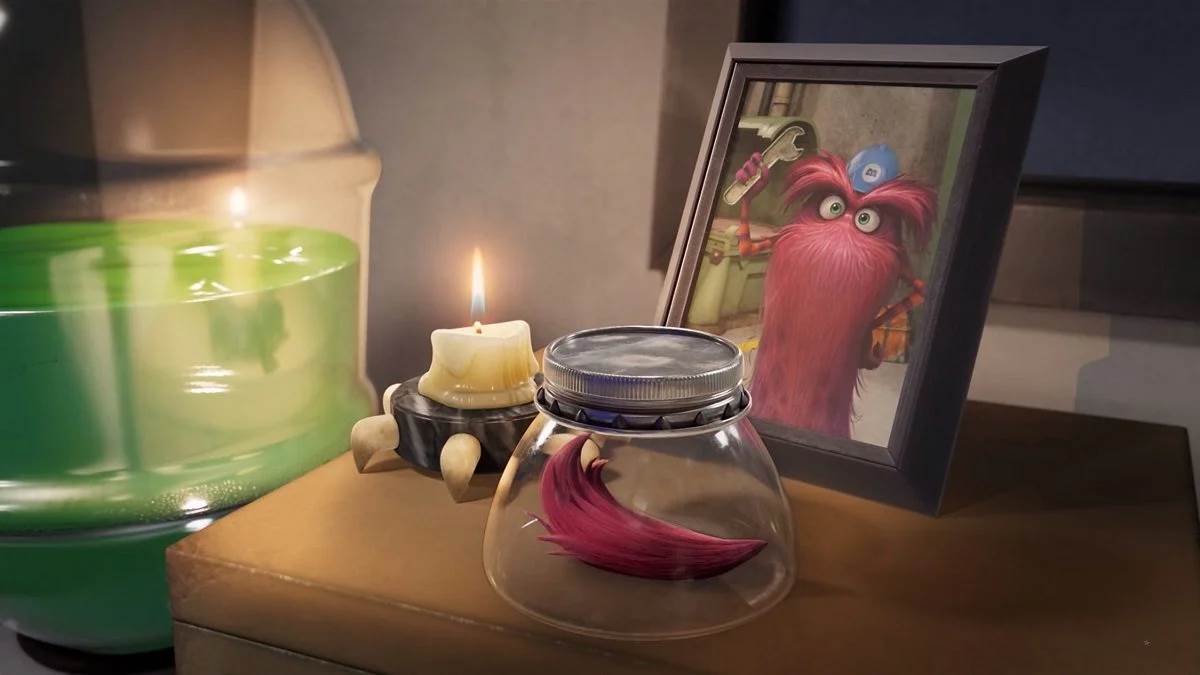 Back down at the MIFT office, Tylor is feeding Roto when he gets out of his cage and after a chase with Tylor, ends up eating that last bit of David’s hair. So not only is he chasing down Roto, he now his to cover his tracks and replace the hair too so the team thinks he’s as reliable as David was. As he is chasing down Roto, he comes upon Roze, who he sees has the same color hair as David, and tries to get a lock of her hair. She threatens to call security, and Tylor sees Roto in the tubes and runs off after him instead before getting stopped by Val, who takes him to David’s hallway lunch, where he sees the affinity that not only the MIFTers had for him, but the whole of Monsters, Inc.