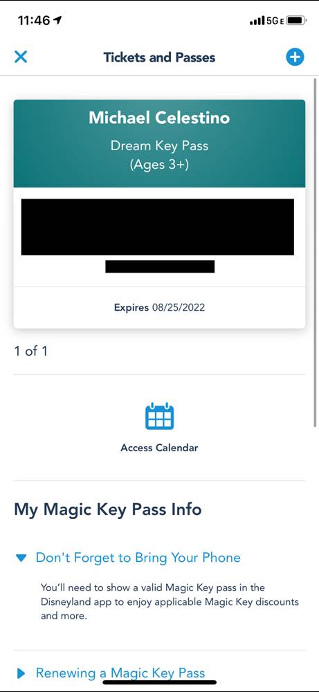I immediately received a confirmation, was asked to input some additional personal details such as my address and phone number for the new Magic Key account, and then I saw that my parkhopper had instantly been modified to the “Dream Key Pass” Magic Key in the “Tickets and Passes” section of the app, complete with scannable barcode for entry into the parks and a link to the “Access Calendar” blockout dates.