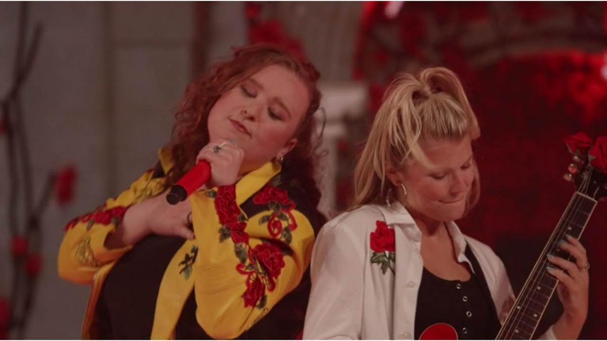 The third performance is a rock-and-roll version of “Home” from the Broadway version of Beauty and the Beast, which was featured in the second season of High School Musical: The Musical: The Series. Julia Lester, who played Belle in the show-within-a-show, takes the lead on this remix, which has transformed from a heartfelt ballad into an angry rock song. The set adds stairs leading up to a castle covered in rose vines. Red roses accent all of the musical instruments and even the mic stand, while Lester rocks out in a black and yellow leather ensemble with embroidered roses.