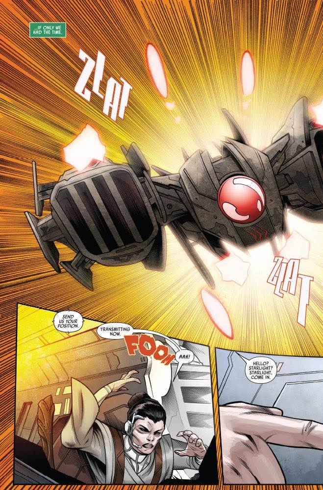 The High Republic #9 begins with a shocking in medias res opening space-battle sequence that sees Wayseeker Jedi Orla Jareni in combat against a Nihil stormship commanded by none other than Jedi Knight Keeve Trennis, who we’ve come to know as one of the central protagonists of this comic series. Why has Trennis seemingly given up the path of the light to join the Jedi Order’s sworn enemy? We’re immediately given a series of flashbacks to explain how these characters got to that point, though I won’t spoil the eventual reveal in this review. Suffice it to say that we do get an explanation pretty much right away (I was afraid we’d have to wait until next month, or worse yet the end of this arc) and the action continues in the “present” as more Starlight Jedi-- including my favorite, Master Skeer-- show up to defend Jareni from the perceived Nihil attack. Then we follow Keeve and her apparent deserter-in-arms Terec to a Nihil base where she makes contact with the local leadership of her new faction. But as I hinted at earlier, things may not be quite exactly what they seem, but I’ll let the comic itself tell you the whys and hows if you choose to read it.