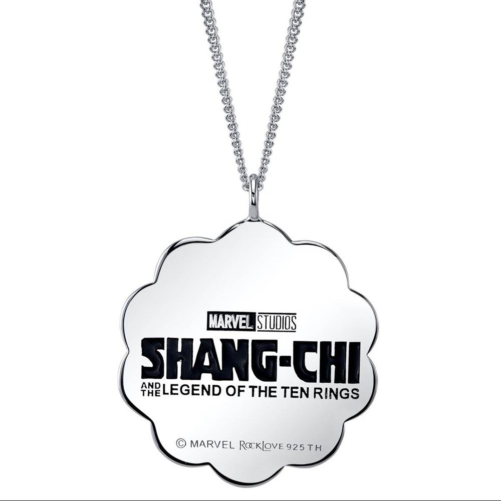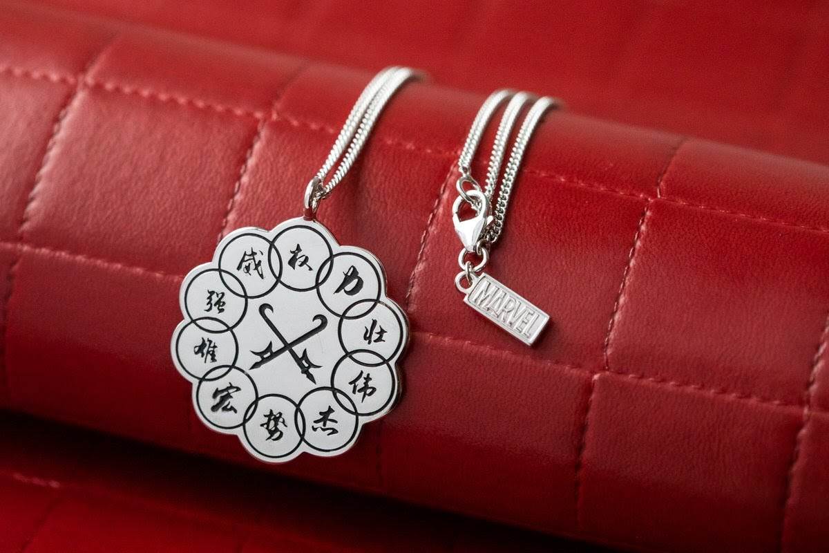 “A unique silhouette following the shape of the ringed crest, the reverse of the pendant is etched with the official branding of Marvel Studio’s Shang-Chi & The Legend of the Ten Rings.