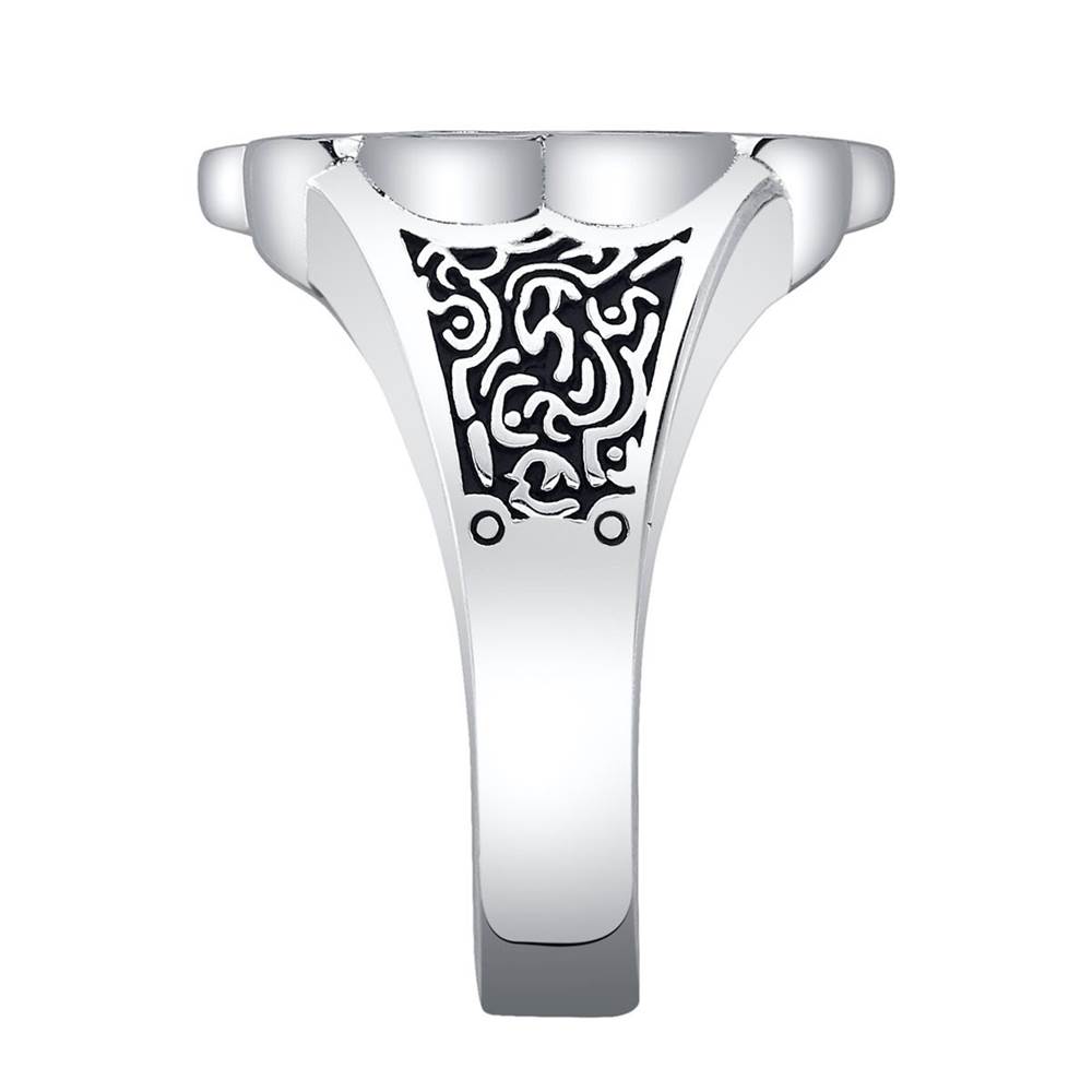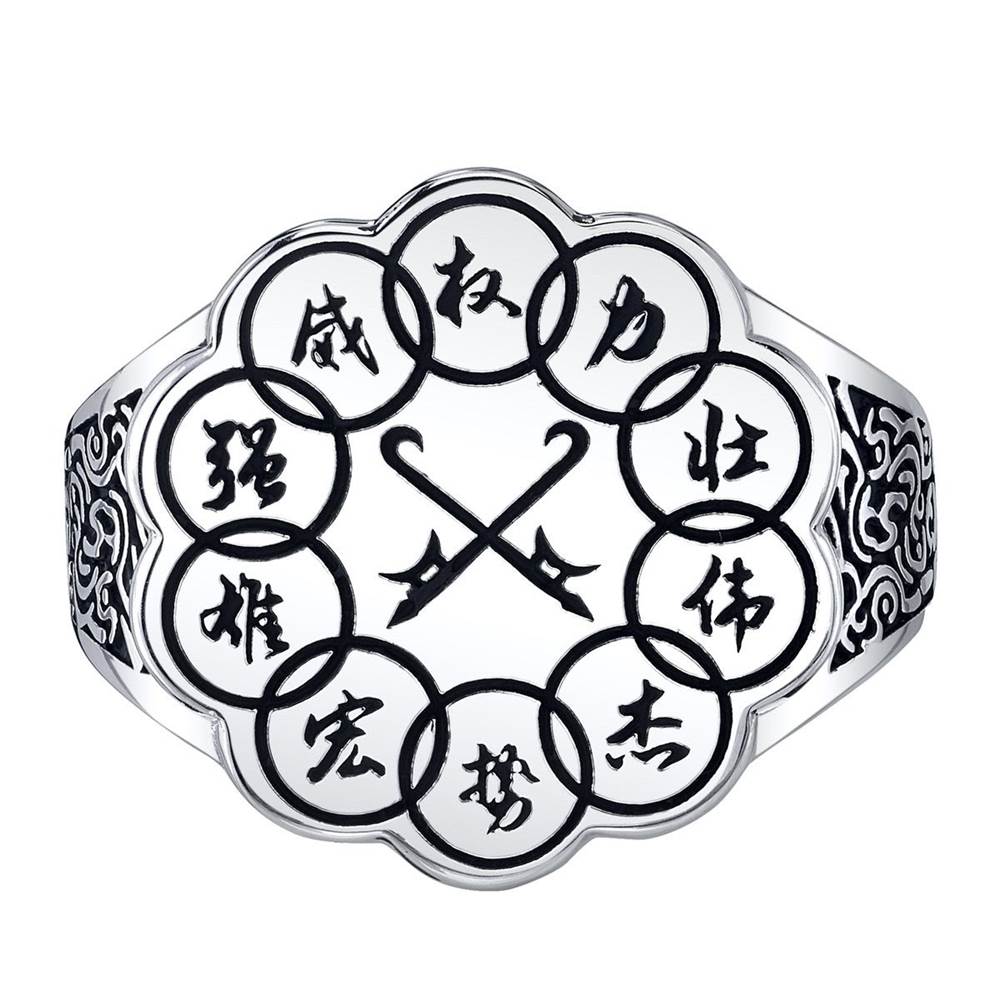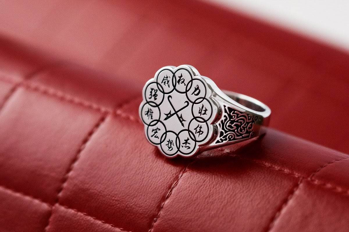 Solid sterling silver, brightly polished and blackened for contrast, this distinguished signet features the insignia of the clandestine Ten Rings organization.”