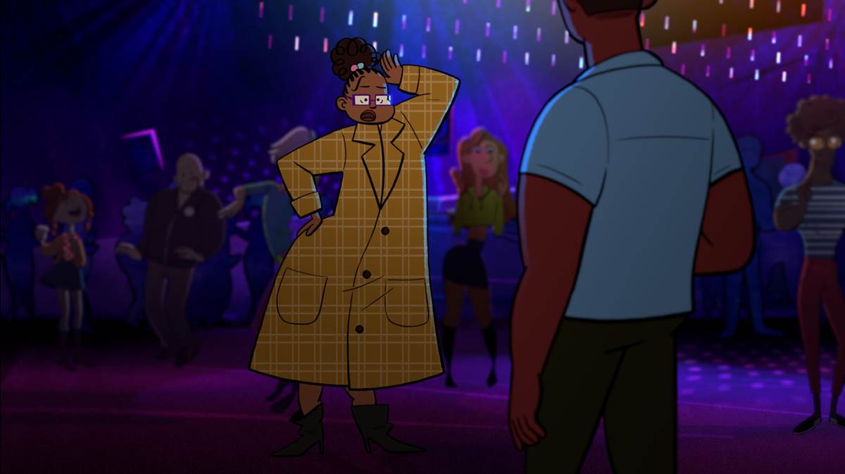 Twenty Something is also the third SparkShort to be made in a traditional 2-D format, following Kitbull and Burrow. “I knew I was going to need to make this a 2-D film,” says Corbin. “Since we're at SparkShorts, our budget is small. And if I was gonna pull off a movie with dialogue and all these extra characters in the club setting, 2-D was the route to go. And it’s honestly my first love. I got into animation because I loved drawings. And to see those drawings come to life is a super special moment. So, I was encouraged by seeing amazing 2-D SparkShorts that had come out before. Like, Burrow and Kitbull, and I knew it was the path for me. [Twenty Something] was really inspired by older vintage cartoons specifically in the 60s and 70s. And [we] try to get some of that charm and appeal into the design that we have there.”