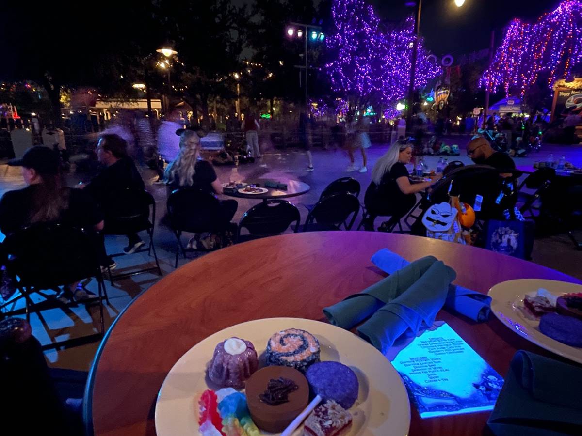 Oogie Boogie Bash kicked off at the Disneyland Resort on September 9th, a separate ticket event at Disney California Adventure Park. Characters from Tim Burton’s The Nightmare Before Christmas are at the center of the event and that extends to one of the event add-ons, the Oogie Boogie Bash Dessert Party. It comes with a curbside table and chairs along the parade route during performances of the Frightfully Fun Parade, a plate of themed treats, and beverage service for $84 per Guest.