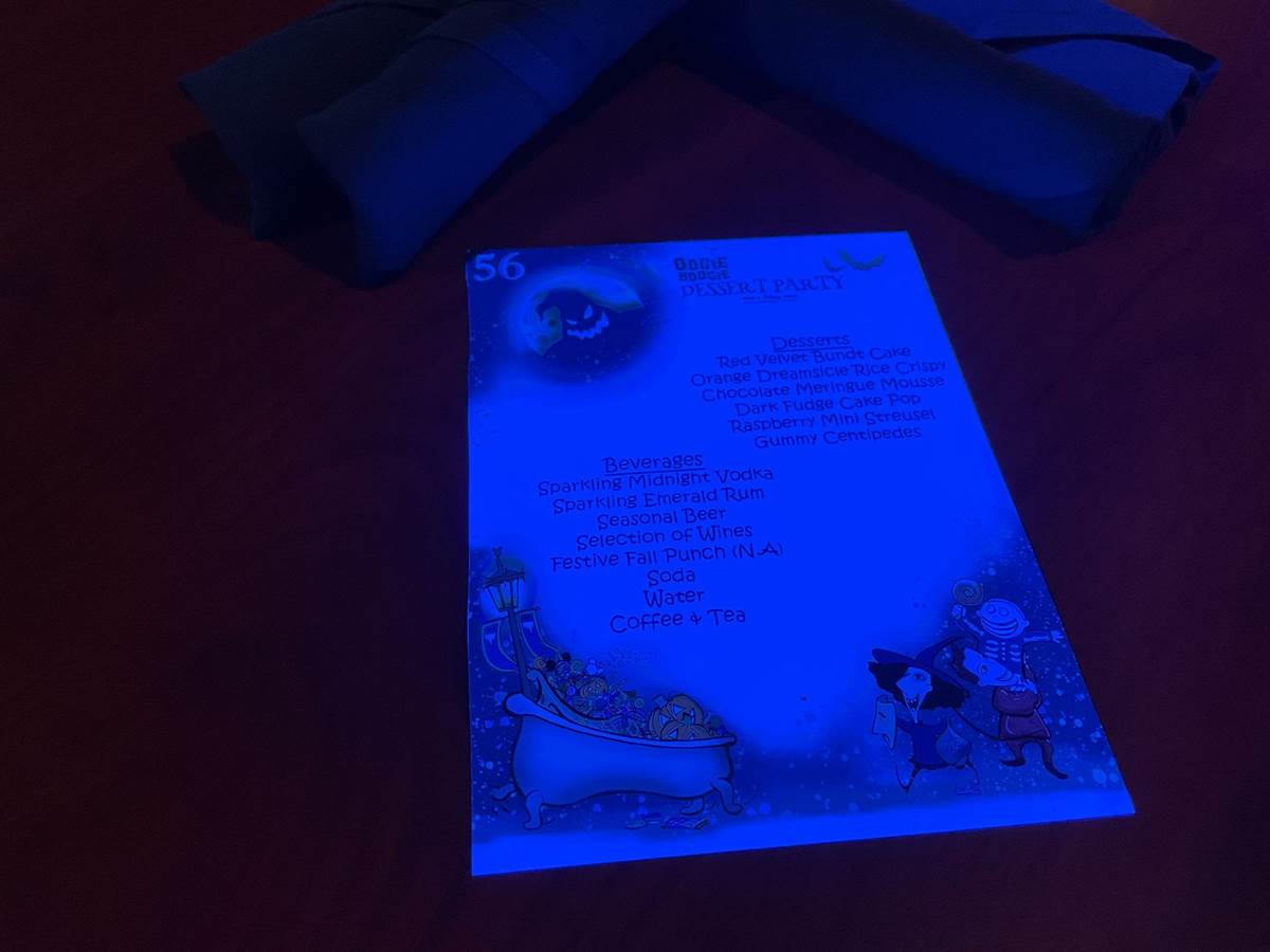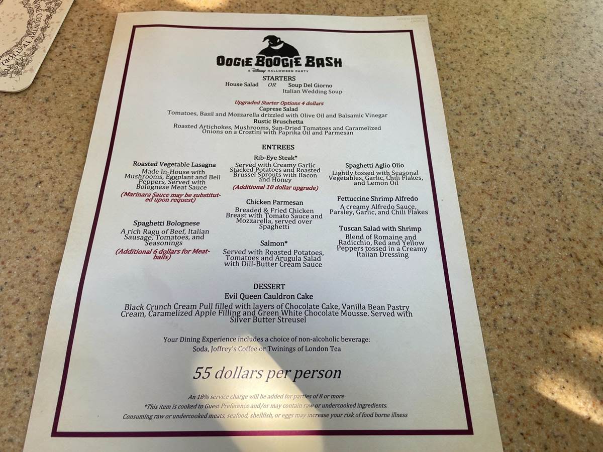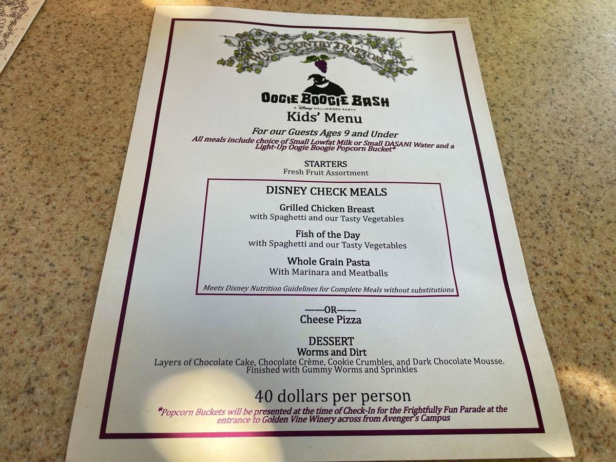 The kids menu is $40 per person and comes with a light-up Oogie Boogie popcorn bucket.