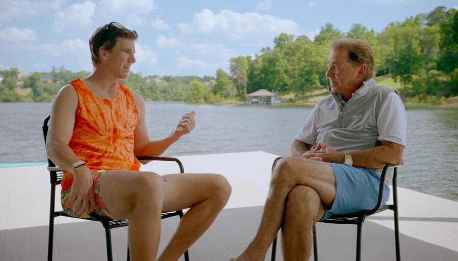 In the third episode, simply titled “Nick Saban,” Eli catches up with the greatest coach in College Football history and discusses his process. The coach also shares some funny stories and gets Eli into the water to try his luck at tubing.