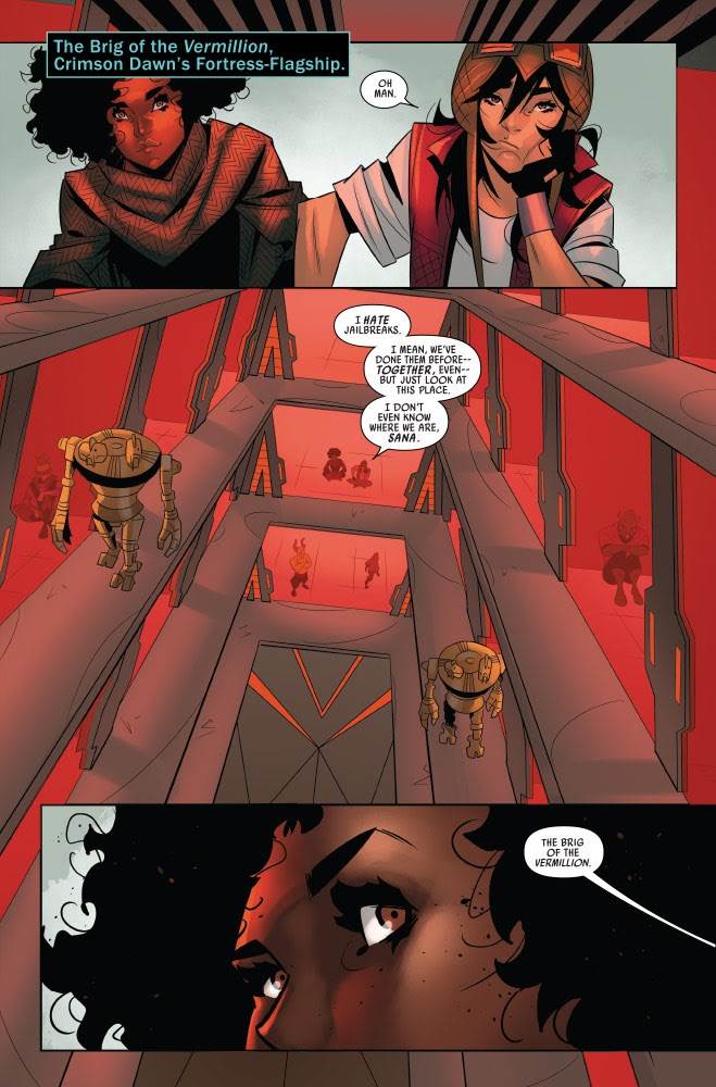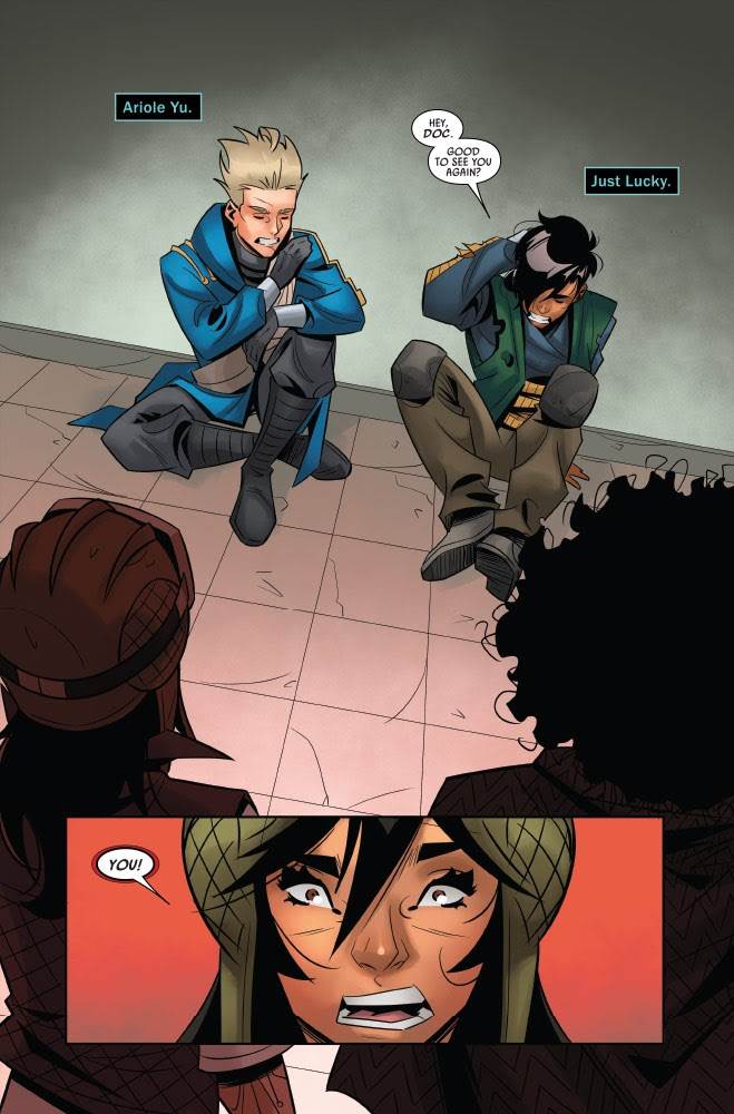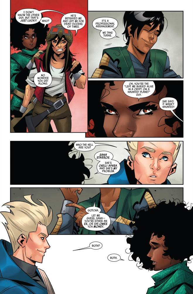 In issue #14 of Star Wars: Doctor Aphra’s second volume, Chelli and her ex-girlfriend Sana Starros find themselves imprisoned in crime syndicate Crimson Dawn’s flagship the Vermillion after infiltrating the auction at which Lady Qi’ra sold Solo to the highest bidder. In the same cell, they find themselves face-to-face with assassin Just Lucky and his partner-in-crime Ariole Yu, who had traveled to the planet Jekara under different circumstances.