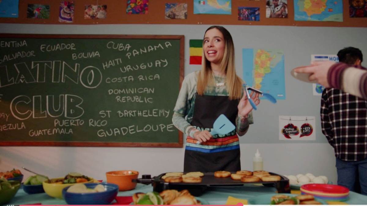 At Heritage Night, Gabby stands at a griddle serving arepas, which everyone loves. She tells the group that it’s her Abeulita’s recipe and when someone asks her for it, she offers to send it to the entire Latinx Club group chat. She asks her phone in Spanish to send it, but she accidentally sends the notes she took about everyone’s interests. They feel stalked and are weirded out. While Gabby tries to plead her case, she tries to grab Santino’s phone and he knocks backward, his harp-playing hands landing on the hot griddle.