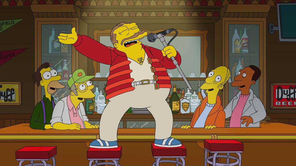 Marge bursts into Moe’s and apologizes to Sasha: “Once my husband sang and danced to me about what I did, I felt terrible.” “All I wanted to do was recapture my glory days when I could have become anything,” admits Sasha. The rest of the Y2K cast enters, having been called to the bar by Marge, and she apologizes to them as well. “I was supposed to manage the stage, but instead I just managed to screw everything up.” She says there’s still time to put on “the best show of the latter part of our lives,” but suddenly Barney breaks out in song about why trying doesn’t get you anywhere while dressed as Freddie Mercury. Sasha interrupts him: “That’s the saddest thing I’ve ever heard. Barney, nobody needs to do this show more than you… except me!” We cut to opening night of the musical and a sold-out crowd fills the high school auditorium. Backstage, Homer asks, “When I’m onstage and it’s not my turn to talk, can I look at my phone?” Marge sets him straight and gets everyone else in position to start the show.