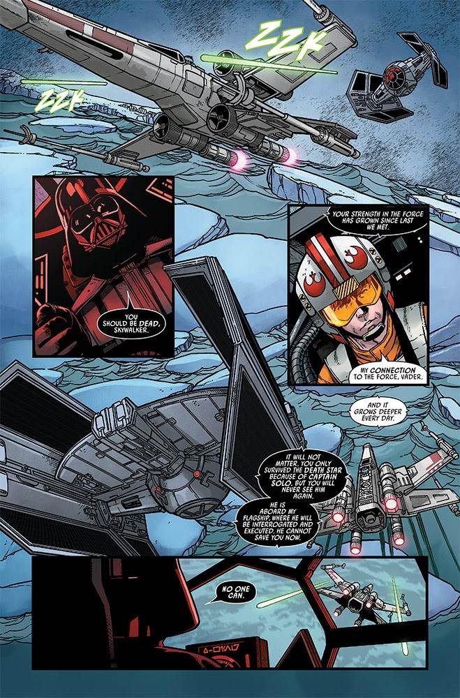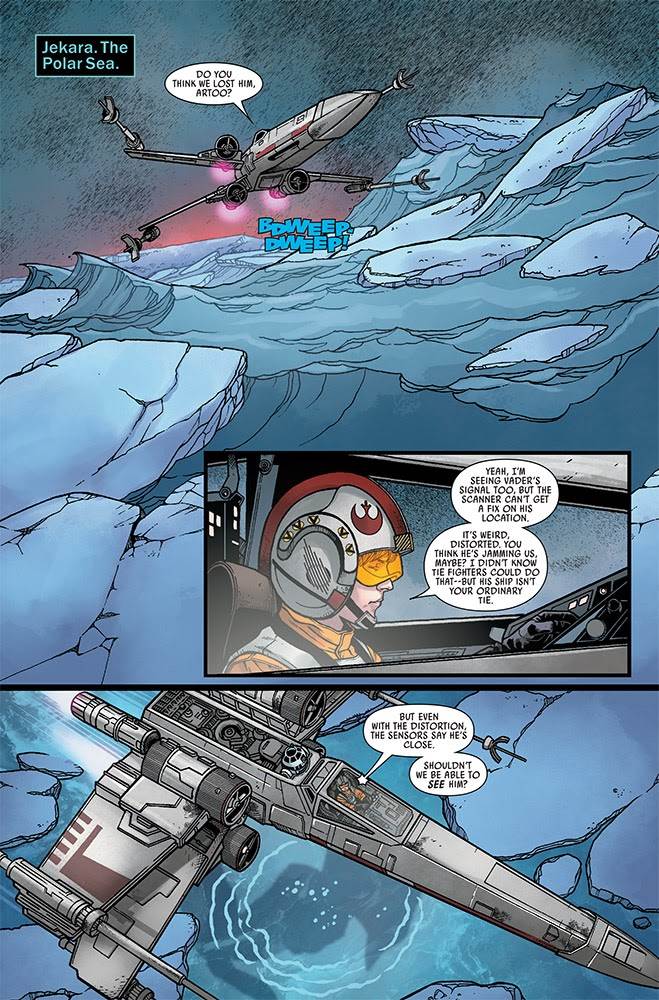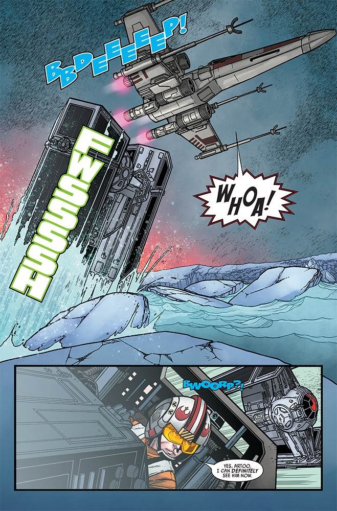 Star Wars #17 begins with Luke using his X-wing to lead Vader’s TIE Advanced away from his friends for a chase among Jekara’s polar ice caps. This is a pretty exciting action sequence, with the young would-be Jedi figuring out how to use the perilous frozen terrain to his advantage.
