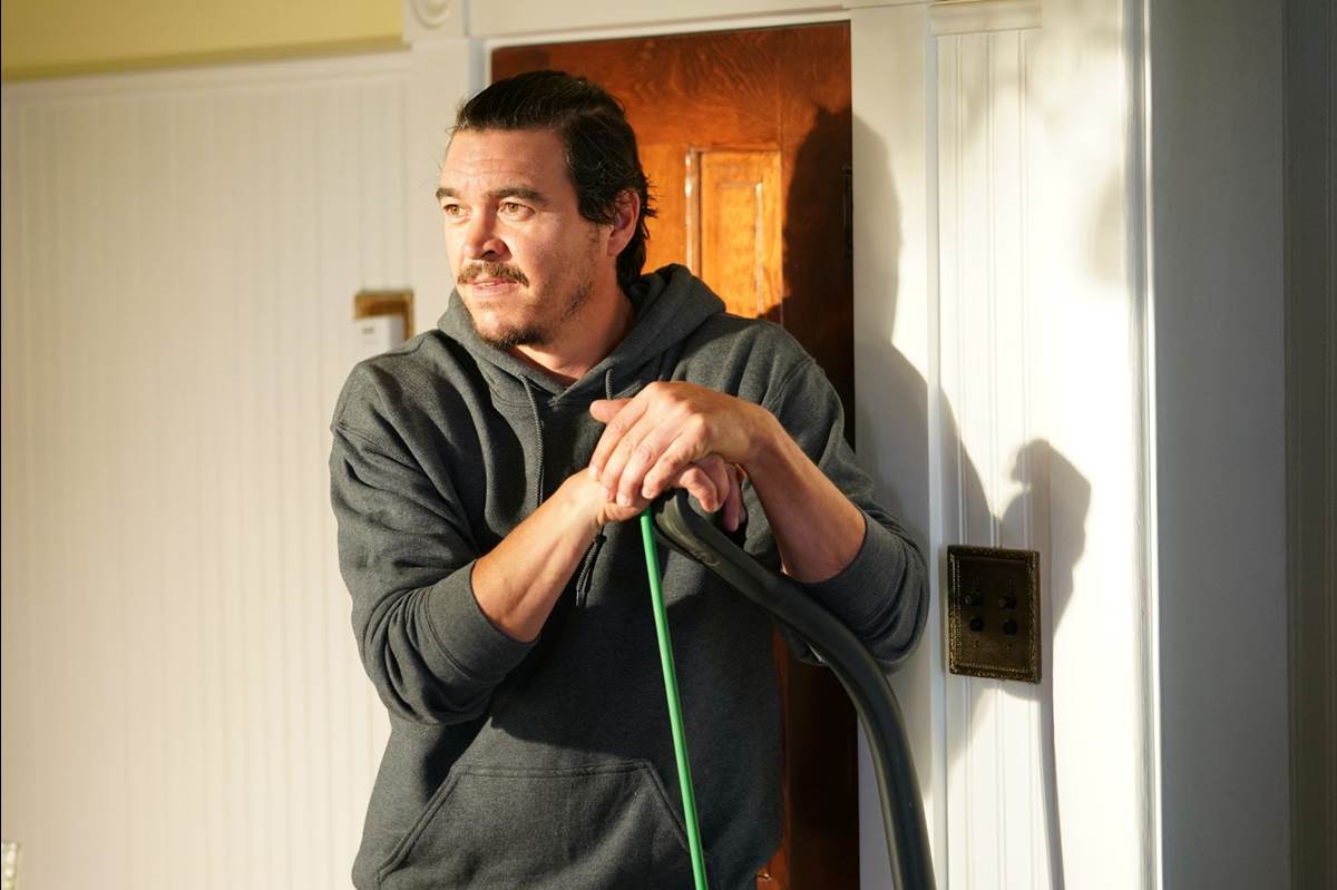 Jenny hears a noise outside of her house and grabs her gun before opening the door to find the guy she recognized in the bar. “Hey Travis, or is it stone?” Travis (Logan Marshall-Green) is working undercover and couldn’t reveal his identity at the bar. Jenny invites him in and apologizes for not reaching out to her when he heard Cody died. They sit together on the couch drinking wine and Jenny reveals that her son recently left for college, making Travis feel old. He explains that he has been married and divorced since the last time they saw each other and says something to make her laugh, which hurts her wound. He begins to move closer to her on the couch as he asks about her battle scars. As they talk, he moves his lips within centimeters of hers as she asks “Do you want to see?” “You know I do,” he responds. Jenny climbs over his lap and the two begin making out.