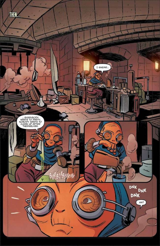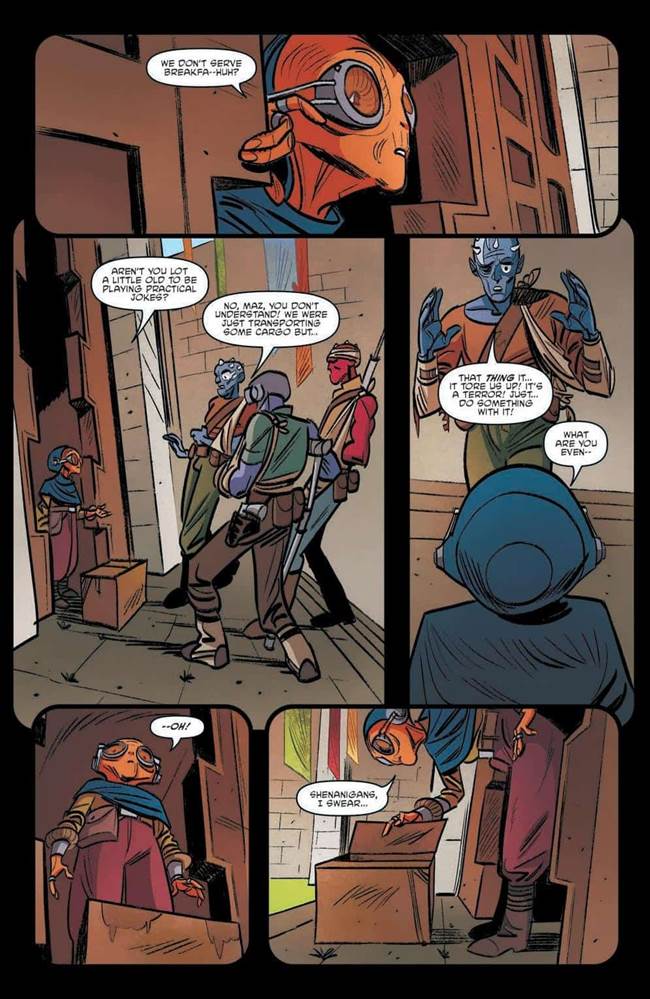 Our heroes have traveled to Takodana to assist its lone Jedi protector Sav Malagán in defending the planet against a Nihil attack, but they soon find themselves looking after a pair of somewhat suspicious would-be defectors from the ruthless band of marauders. And in flashbacks, we get the backstory of how Maz first came into contact with Qort, the powerfully Force-sensitive Aloxians who was left on her doorstep by some smugglers. Maz’s loadlifter droid HURID-327 (first seen in Star Wars: The Force Awakens) has a difficult time babysitting the infant alien, because Qort keeps ripping its mechanical arms off and making a mess of the castle. Back in the “present,” Sav and the Padawans help Maz prepare for the incoming attack, while continued flashbacks inform us about the Aloxians’ home planet of Zav Alox, the murderous crabs that live there, and how Qort’s species use the crabs’ skulls as masks until they are fully grown.
