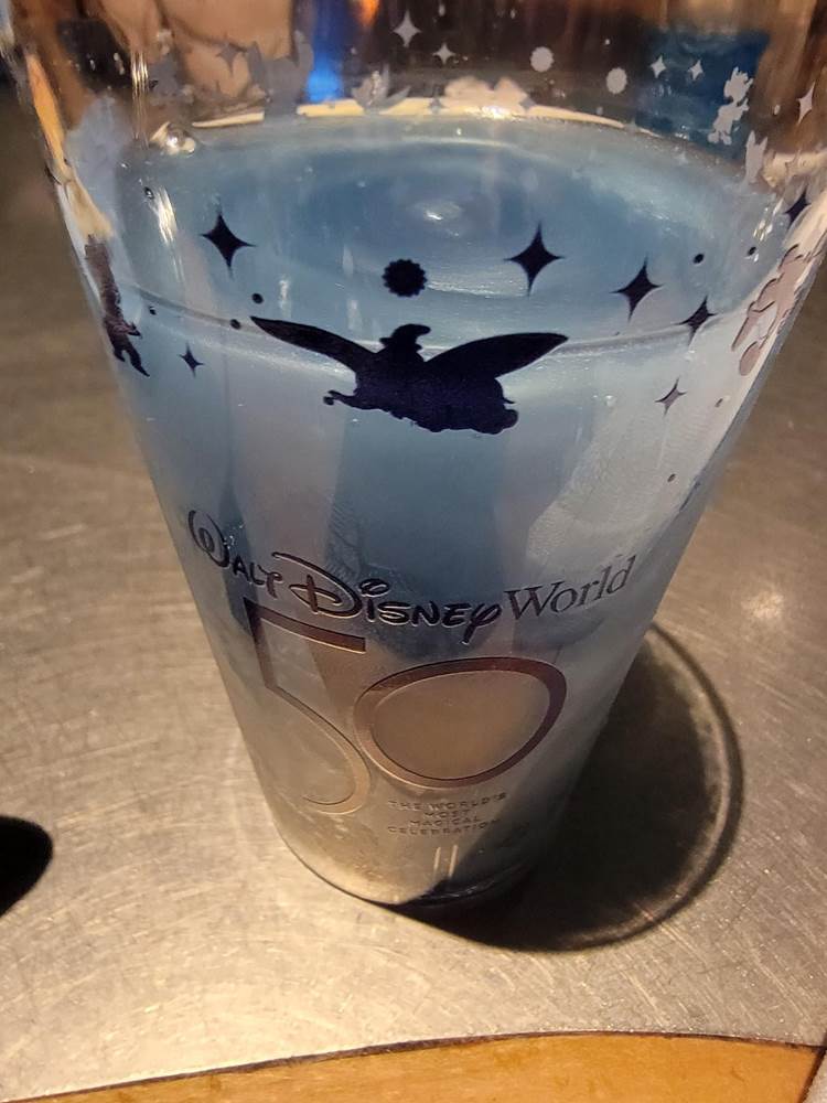 Soon, a lemonade beverage arrived in a delightful Walt Disney World 50 glass. Around the upper border, along with silhouettes of twinkle stars, you can find Tinkerbell, Stitch, Nemo, Abu, Figment, Cheshire Cat, Orange Bird, Chip, Dumbo, Mickey Mouse, Donald Duck, Stitch, Bambi and Gus the mouse (not the field goal kicking mule).
