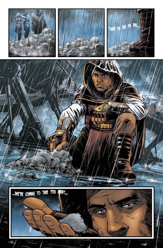 The haunting image of Greatstorm’s lifeless corpse opens the issue with an ominous, foreboding tone that reverberates throughout, as we follow Jedi Knight Emerick Caphtor, tasked with finding answers regarding this shocking turn of events by Jedi Council member Stellan Gios. Meanwhile, a private investigator named Sian tracks a target through the seedy underworld of Coruscant. It’s heavily implied that these two would-be detectives are destined to cross paths during this storyline, though that doesn’t happen before the end of the first issue, which asks far more questions than it answers. What sort of weapon do the Nihil possess that’s capable of turning Jedi into dust? How is this mystery connected to Sian and the enormous alien that guns her and her contact down in a Coruscant alleyway? And why is an eerie nursery-rhyme song with frightening lyrics suddenly stuck in both Stellan and Emerick’s head?