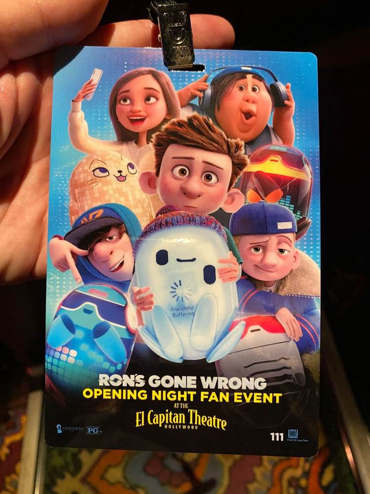 Everyone in attendance at El Capitan’s Ron’s Gone Wrong Opening Night Fan Event received a cool exclusive credential featuring the movie’s poster art and characters, plus a great Ron’s Gone Wrong-branded knit cap, representing the somewhat off-kilter hats Barney’s grandmother makes for him in the film.