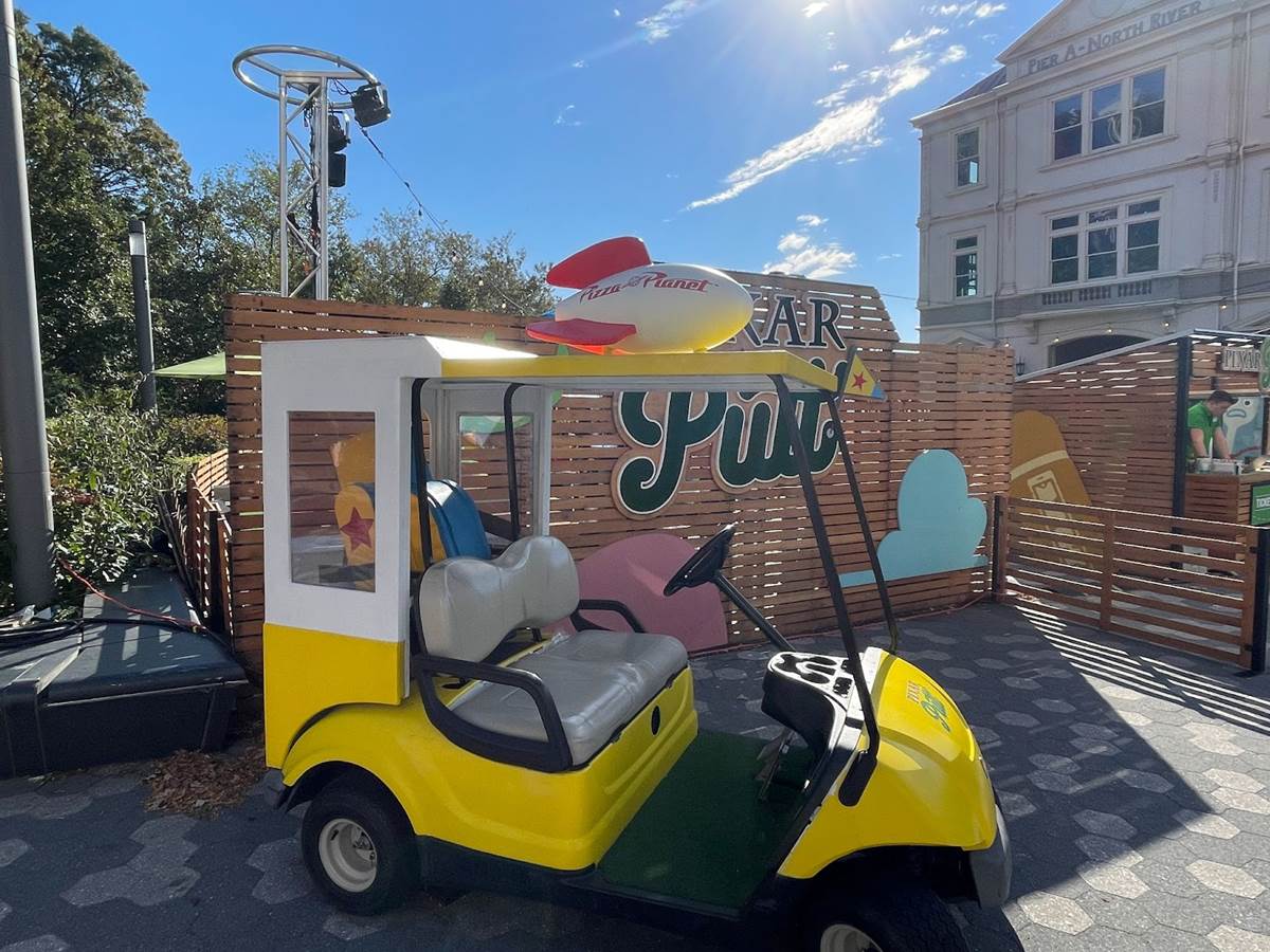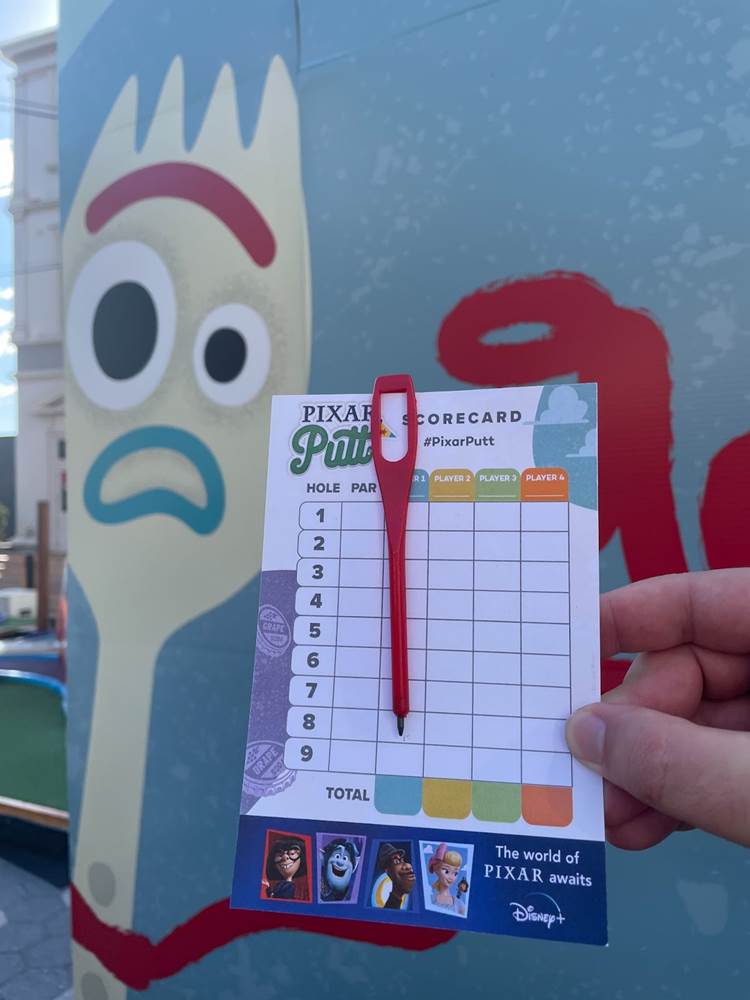 The fun begins before you even check in with a Pizza Planet golf cart with a Luxo Ball-themed golf bag parked out front. Ticket prices vary by day and time and must be booked in advance by visiting PixarPutt.com. Themed scorecards are given at check-in when you pick up your putter and balls.
