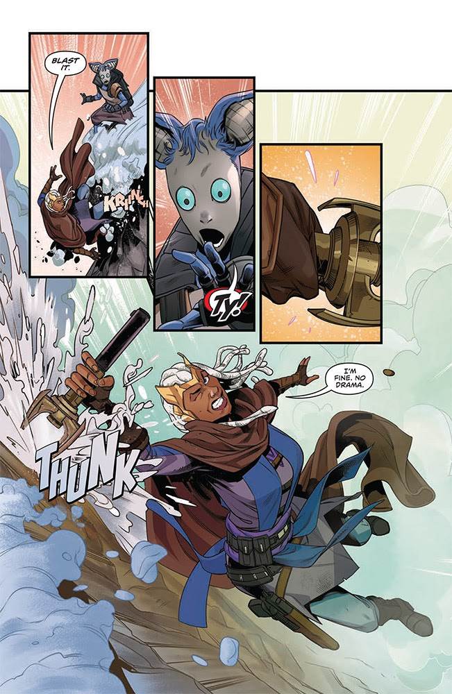 Star Wars: The High Republic Adventures - The Monster of Temple Peak #3 begins where the previous issue left off, naturally, with former Jedi Padawan / monster hunter Ty Yorrick in pursuit of a fearsome creature called the Gretalax, with the help of the irritating-but-enthusiastic Drewen– a local of the planet Blarrum.
