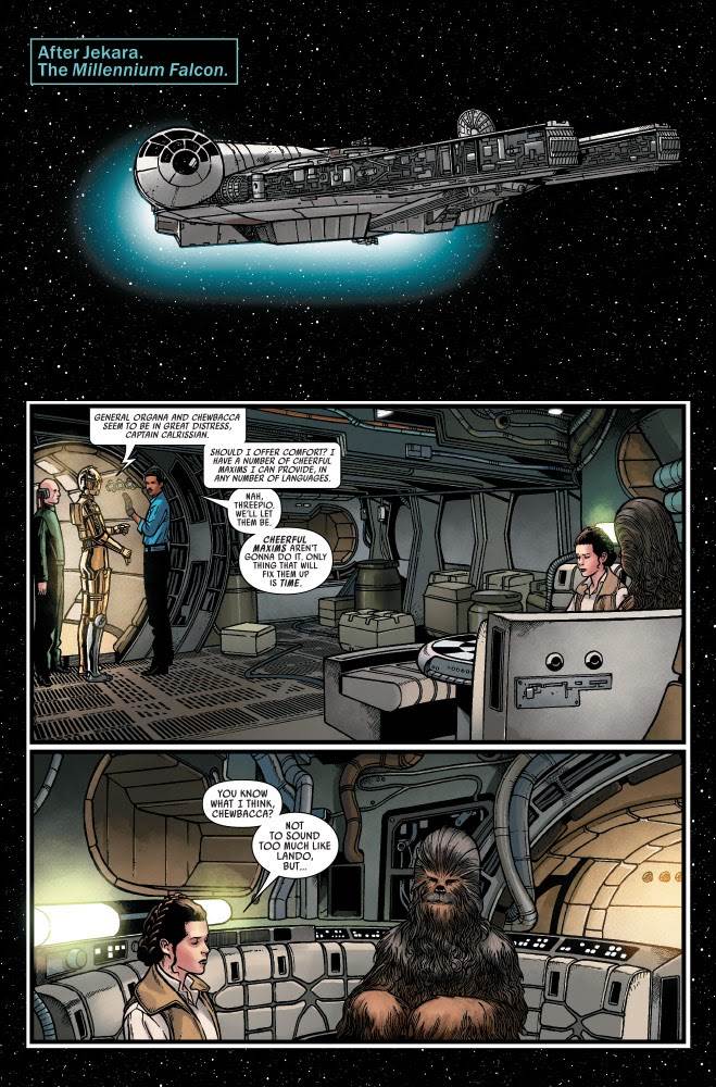 Qi’ra tells Leia about her past with Han, growing up on Corellia, and how she always saw a good side hiding underneath Solo’s irascible scoundrel persona. She also informs the Rebel Alliance leader that Crimson Dawn has operatives working in all corners of the galaxy, including the Galactic Empire, and that her intent was to orchestrate a reunion between Han and Leia after getting what she needed from that carbonite block– though Leia is having none of it due to her grief and anger. It’s a tense discussion with plenty of crisp dialogue from Soule’s pen, and the gorgeously staged illustrations by artist Ramon Rosanas and colorist Rachelle Rosenberg go a long way in conveying a properly somber tone for the proceedings.