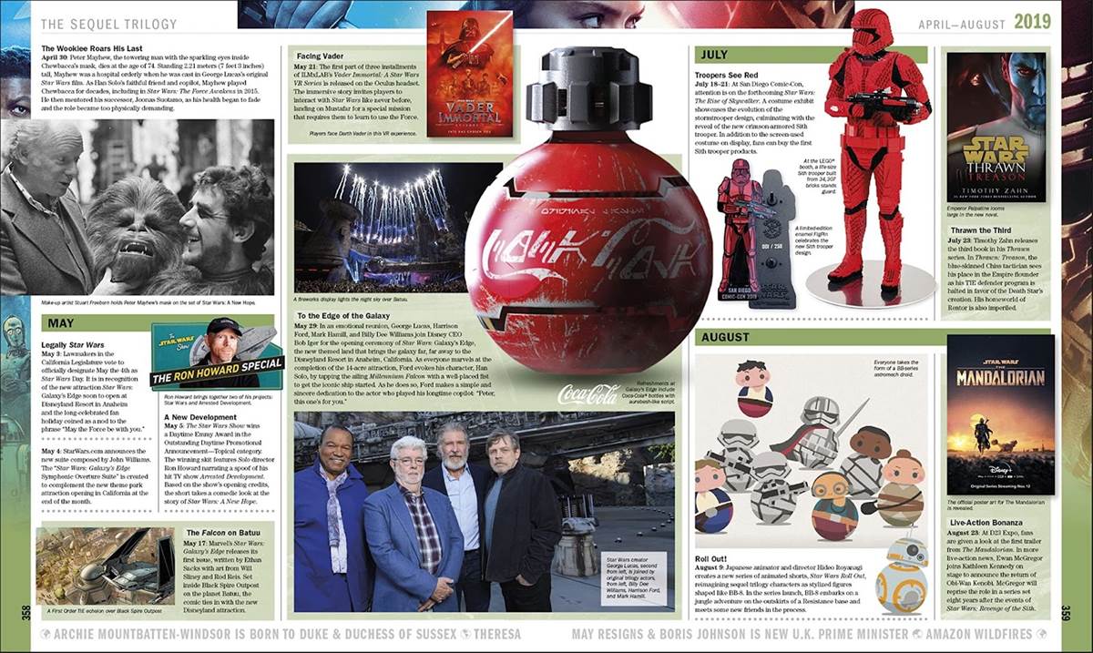 Then Wallace tackles the “Dark Times,” the period from the mid-80s through the early 90s during which there wasn’t a tremendous amount of Star Wars content being produced, though he does manage to find plenty to talk about anyway, and fortunately this era ends with the then-flourishing Expanded Universe of novels and comic books, plus the relaunch of Hasbro’s popular Star Wars action figure line. And after Hidalgo tackles the prequel trilogy and The Clone Wars animated series, he and Baver take on the new stuff: basically everything that has happened since Disney bought Lucasfilm. It’s particularly interesting how all of these authors place milestones in the Star Wars timeline within the context of real-world current events such as numerous NASA space launches all the way up through the January 6 insurrection at the U.S. Capitol building this year. The vast majority of entries are accompanied by illustrations, set photography, and/or poster art promoting the various releases documented within, and it was great to be reminded of events I had forgotten about– not to mention more than a few I had the wonderful opportunity of attending myself, such as Star Wars Celebrations and movie premieres.