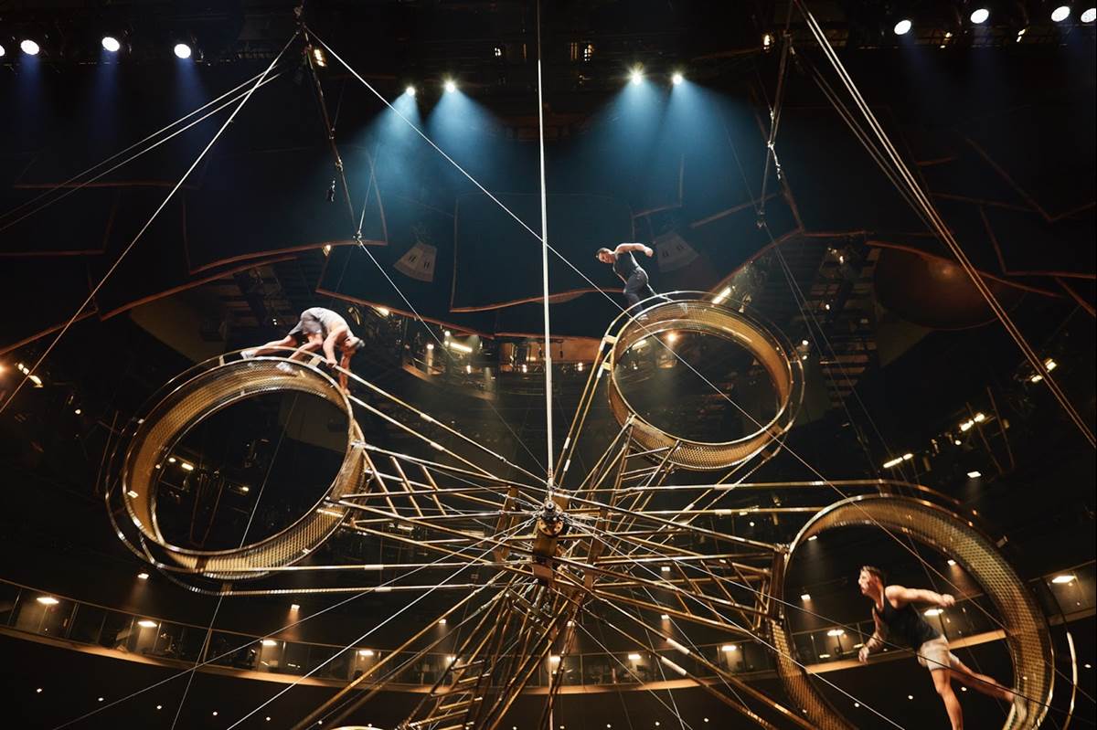 The Old Mill double wheel act is inspired by Walt Disney’s groundbreaking 1937 animated short of the same name, which is seen in projections throughout. In a display of tenacity, perseverance and rise-and-fall motion, owls dreamed up by Julie’s imagination weather a storm using teamwork and courage to carry them through the powerful wind and rain that threaten their windmill home. The windmill of the film is represented in a spectacular, churning, fast-moving double wheel structure. Gravity-defying acrobats are in constant motion with the turning wheels—at times airborne—with astonishing balance and agility.