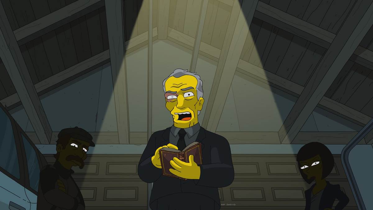 At home, Ned counts the money as Rodd and Todd watch. They argue about what they should do with the money, and Flanders flashes back to his sheriff grandfather (Timothy Olyphant) stopping a convenience store robbery some decades earlier. In the present, Ned donates the bag of money to a local orphanage, and the proprietor Barb (Cristin Milioti) wants to reward him, but Flanders refuses. “What if you donated that money in the name of someone special?” Ned decides to donate the money in the name of his grandfather, who happens to have the same name, so Flanders still gets all the recognition for the gesture of charity. Next we get a montage of Kostas Becker’s minions disposing of the Rich Texan’s corpse, followed by Becker on the phone with contact, promising proof of the assassination: the Texan’s face in a breifcase. Becker then sees a news report about Flanders’s donation and vows to collect another debt.