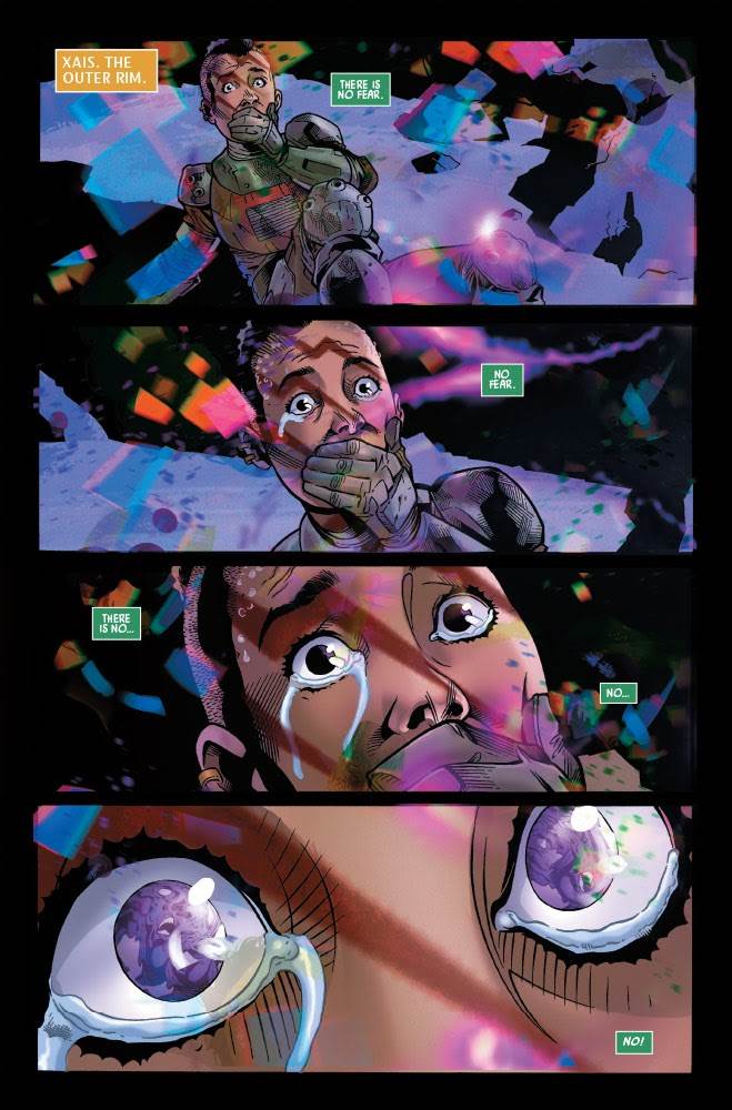 Cavan Scott and his artist Georges Jeanty continue to prove themselves an ideal team-up for this story, with colorists Carlos Lopez and Jesus Aburtov really driving the point home with the swirling, multicolored nightmare you can see in the preview images I’ve included in this review. The scenes of Keeve’s descent into madness are like something out of a particularly disturbing horror movie, as are Ceret’s insistence that this new peril feels like “nothing” and “emptiness,” comparing it to a void, unlike the more easily identifiable dark-side presence of other villains we’ve seen in The High Republic like the Drengir. I’m extremely intrigued to find out more as the months go on, and I’m also excited to see how Lourna Dee will take to her newly acquired lightsaber. Will she use it to go up against Masters Avar Kriss and Sskeer in the next issue? Consider me counting down the days until we find out.