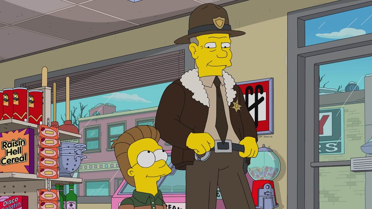 A teenage Bart enters the shop, having earned his “Online Citizenship” badge at the Boy Scouts “for being polite on social media.” Then Lisa comes in, saying she got 100 RSVPs to her birthday party from people who probably just want to meet Homer, who receives a mysterious blank postcard from Wyoming. “Probably just junk,” he says, tearing it up and throwing it in the trash. But later, after driving past Ned Flanders’s now-boarded-up house, Homer parks his car in a garage and switches to a red pickup truck, putting on a blonde wig. He drives to a diner and eats breakfast, and we see a montage of him in various disguises around town. Later he hikes into the woods and makes his way past a booby trap, but is then held at shotgun-point by Rod and Todd Flanders. Ned emerges from behind a tree and takes Homer to a cabin, where he unpacks the supplies that his friend has brought him. Ned asks how things are in Springfield. “Marge hates me,” Homer weeps, “all because I saved that money’s life and not yours.”