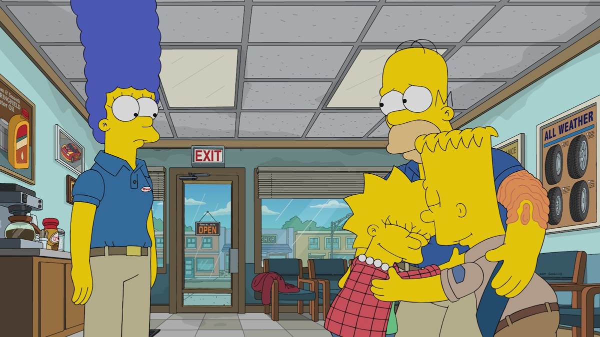A fire breaks out in Flanders’s car, badly burning Homer’s arm as he struggles to free the bag of money, but he’s able to retrieve it while also accidentally dislodging Ned from his seat. “I’m married to the most selfish man in the world,” says Marge, who watched the whole thing unfold. Then Barb appears and praises Homer for saving the orphans’ money and the American flag. Marge shakes her head and walks away while Barb berates Ned Flanders, who has disappeared in the commotion. In a nearby alleyway, Ned receives a call from Becker, who says, “Money can be lost, Mr. Flanders. But a debt never goes away.” After a commercial break, a narrator says that three years have passed since Homer saved the orphanage’s money. And now he’s apparently opened a car repair shop called “Heroic Lube and Tire on Disco Stu Memorial Drive. Marge reluctantly helps in the business, but in private she still hates Homer for what he did to Ned.