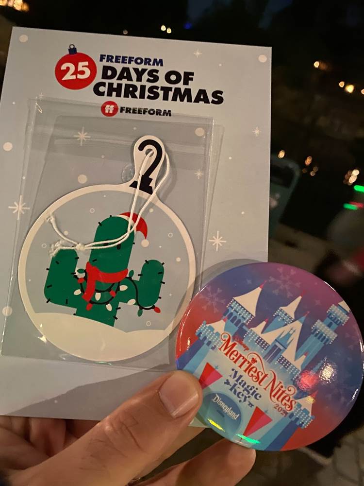 For Disney Merriest Nites attendees who happened to be Magic Key holders, a special button was distributed next to the Rivers of America, along with a Freeform 25 Days of Christmas air freshener.