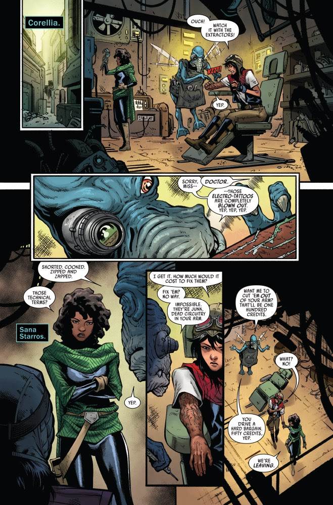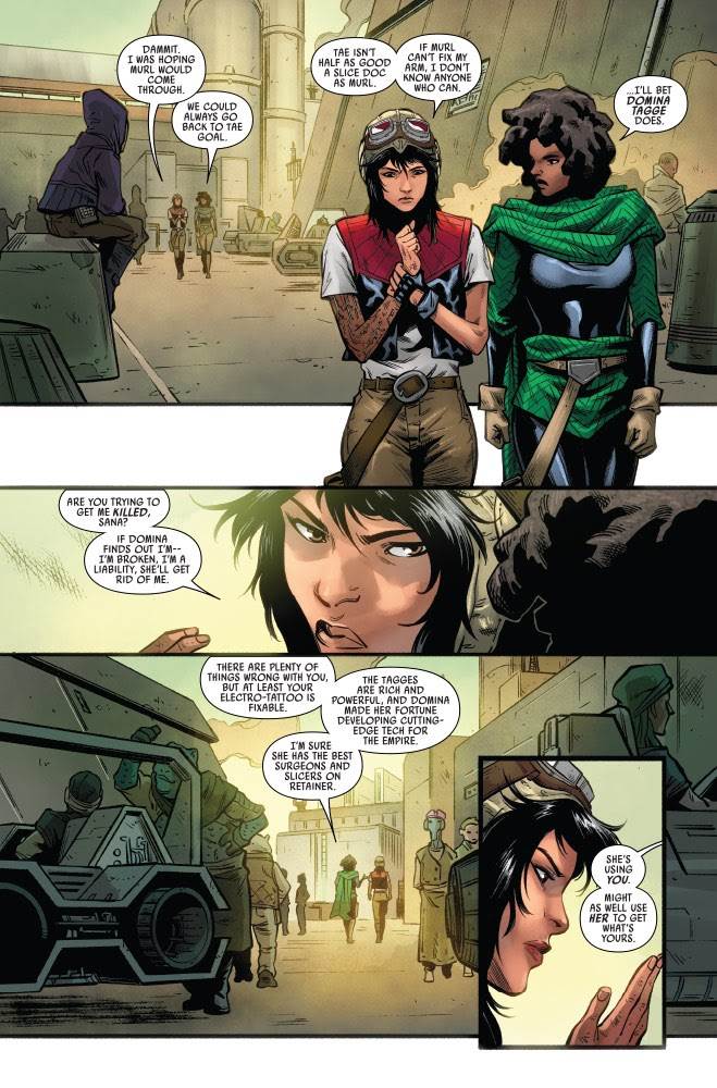 In issue #16 of Star Wars: Doctor Aphra’s second volume, Lady Domina Tagge has started to root out and eliminate the Crimson Dawn operatives acting as spies within her industrial organization. Meanwhile, Dr. Chelli Aphra finds that her electro-tattoos have been completely shorted out by the effects of the thought dowser she used in the previous issue. Aphra and her partner in crime Sana Starros seek help from a Toydarian slicer on Corellia, but he doesn’t seem to be of much use.