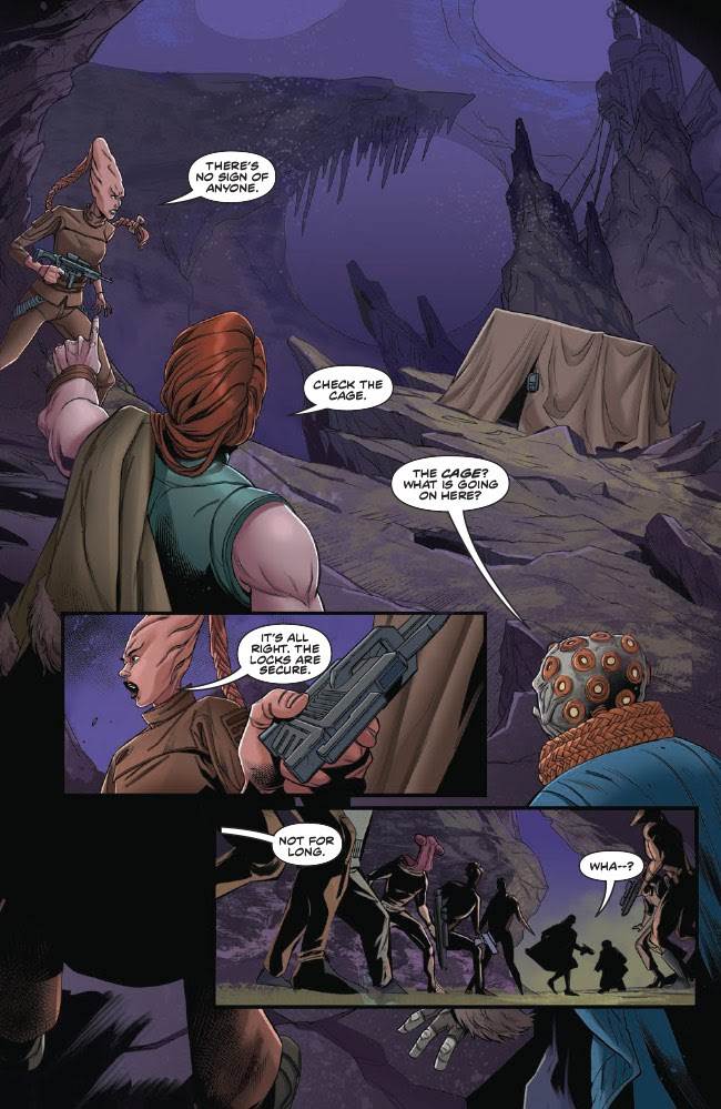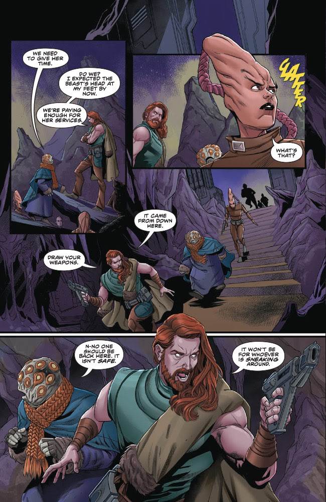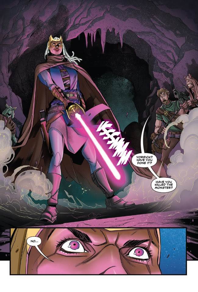 Star Wars: The High Republic Adventures - The Monster of Temple Peak #4 picks up where last month’s issue left off: with former Jedi Padawan Tylera Yorrick having discovered a shocking secret about the monster called the Gretalax that she was hired to track down and kill on the planet Loreth. But we first check in with the villages who actually hired Yorrick, and their leader named Layton who’s hiding an underhanded secret of his own. It turns out that (SPOILER ALERT) Layton and his cronies had captured the Gretalax’s mate (one’s called Greta, the other one Lax… you get the idea) and they want the other one’s head in order to gain some sort of mystical power from its horns. But Ty figured all this out last issue by reading the creature’s mind in an effort to figure out why it was attacking the village in the first place, so she ambushes the locals and confronts them with her lightsaber. That showdown doesn’t quite turn out in Yorrick’s favor, so she calls upon her new spider-like Rock Weaver friends– along with her unlikely Segredo companion Drewen– for help in getting out of a potentially deadly situation.