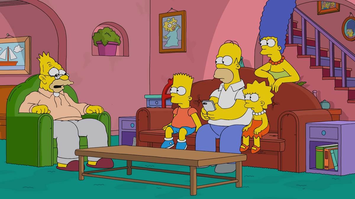 “I even miss you sometimes,” the fake doctor tells Abe when he enters the room. In the present Homer wonders if his encounter with his mother that day was a dream. “It wasn’t a dream! I was there,” counters Abe. “There’s no reliable way I’ll ever know,” concludes Homer. The Nutz app tells Homer he’s found closure, though it comes partnered with a disclaimer that “closure” is no longer considered a valid psychological construct. The Simpson family has a group hug, and Homer says it’s the best Mother’s Day ever. Santa Little Helper drives the point home by bringing in a dead bird for his mother, who gulps it down in one swallow. Homer reveals he made reservations for the finest restaurant in town, where he is chastised for treating the kitchen like a buffet. In the coda, we see more Muttflix programming like “Whatever It Is, Eat It” and “Dropped Food.” Homer sleeps with photos of his mother and has a strange black-and-white dream.