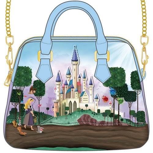 The crossbody bag and mini backpack give a full landscape of the castle in the background accented with square shaped trees. Briar Rose and some forest friends can also be spotted walking a forest path.
