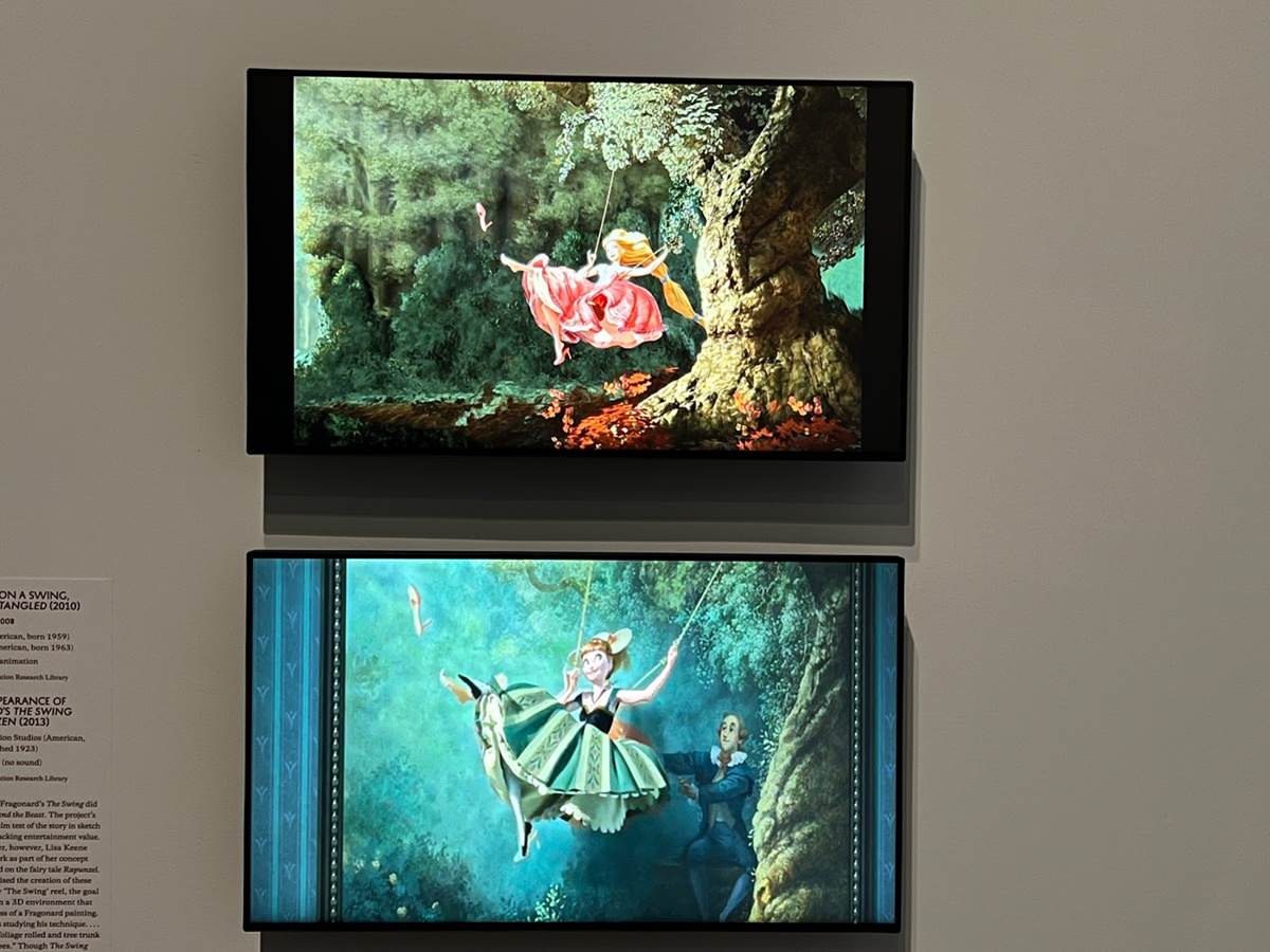 Above all the other displays for me the “DISNEY RENAISSANCE, DISNEY ROCOCO” gallery held the most eye opening comparison between classic art and Disney art. Jean Honoré Fragonard’s The Swing, a picture evoking both motion and emotions, was on display just feet away from displays of concept art for Rapunzel (2010) and the classic scene from Frozen (2013) that featured how it inspired the contemporary Disney film makers.