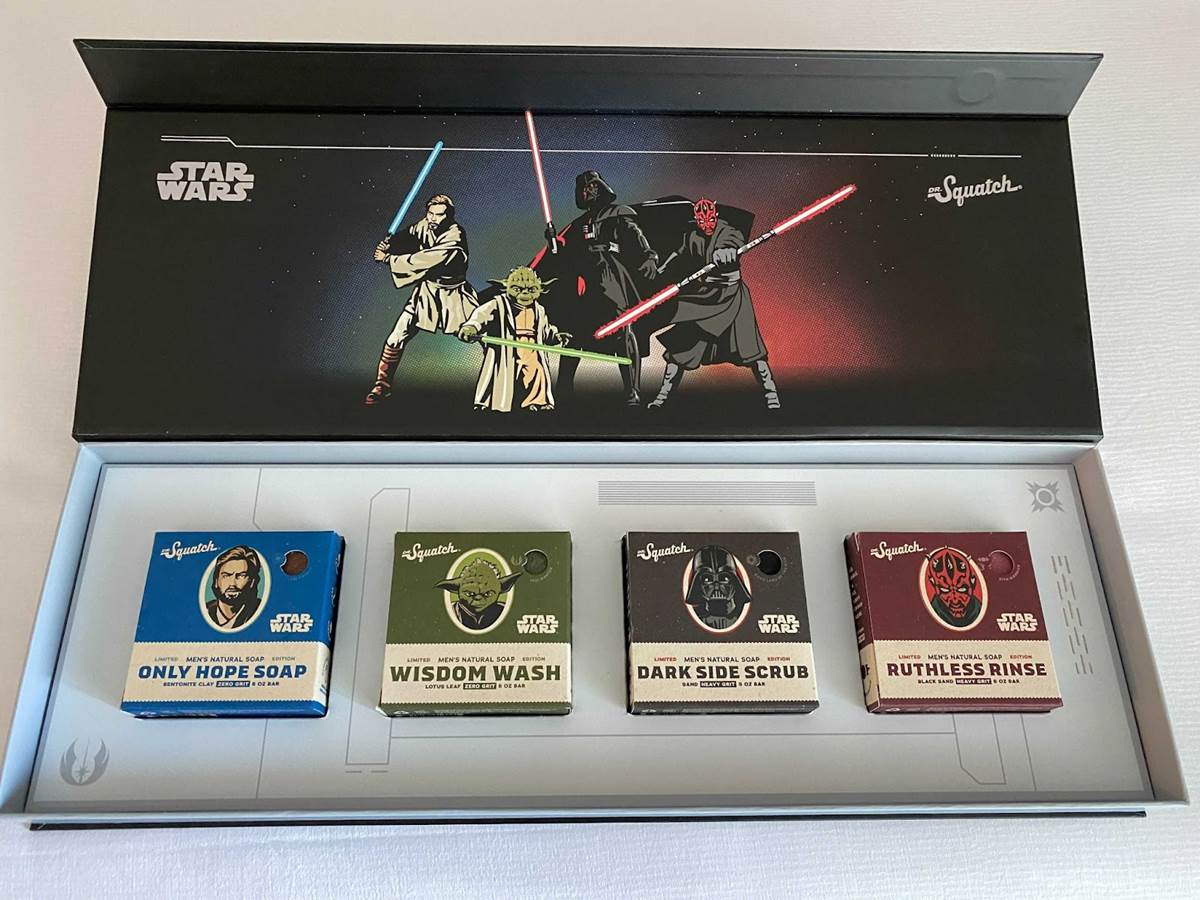 Available now from the official Dr. Squatch website along with a limited-edition collectors box that assembles the four fun varieties of soap into a perfect holiday gift, the Star Wars collection includes bars that help consumers smell like fan-favorite characters Jedi Knight Obi-Wan Kenobi, Jedi Master Yoda, Sith Lord Darth Vader, and Sith Warrior Darth Maul.