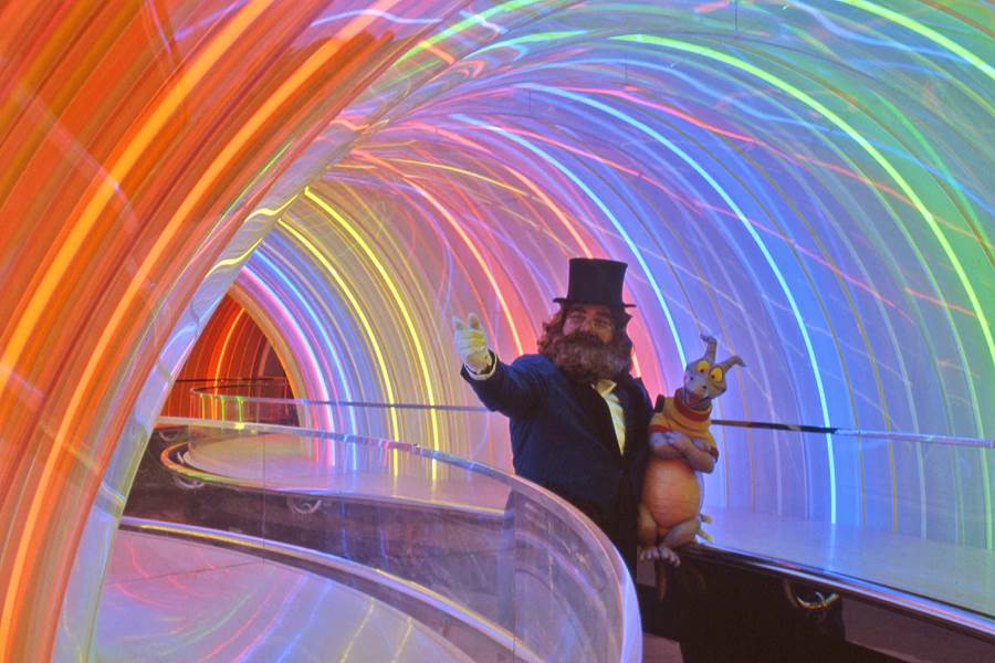 In 1987, Imagineer Tom Morris created the now iconic spaceman Mickey neon art on The Star Trader building in Tomorrowland. Tom became aware of neon art, but there was still a lot of resistance from within Disney, where some thought it could turn Disneyland into a second rate Las Vegas. Spaceman Mickey was created by Morris and perfected by animator Mark Henn. Tom figured it was a temporary stopgap, and was shocked to see it when he returned from opening Disneyland Paris in 1992. Spaceman Mickey still lights up Tomorrowland every night, and this alone shifted everyone’s attitude to neon.