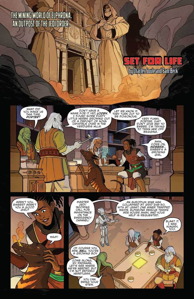 In the first story, entitled “Set for Life,” writer Charles Soule (Star Wars: The High Republic - Light of the Jedi) and artist Sam Beck (Verse) rewind time to a more peaceful, pre-Nihil-prominence period of the galaxy’s Outer Rim. On the planet Elphrona, Jedi Master Loden Greatstorm and his Padawan learner Bell Zettifar are called to rescue a civilian trapped in a mining accident. During this adventure, Bell learns about the cost of selfishness and must face the dangers associated with the Jedi Order’s solemn oath to help others. Up next is “No Stone Unturned,” written by Claudi Gray (Star Wars: The High Republic - Into the Dark) and illustrated by Jason Loo (The Pitiful Human-Lizard), in which we get to follow the crew of the Vessel– namely Leox Gyasi, Affie Hollow, and Geode– as they embark on an Indiana Jones-style quest to steal an ancient artifact from ruins they thought to be abandoned, only to immediately find out how wrong they were. Third is “First Mission” by Justina Ireland (Star Wars: The High Republic - Out of the Shadows) with art by Yael Nathan (Star Wars Adventures), in which we get to see the initial meeting between Vernestra Rwoh and her new Jedi Master Stellan Gios, as they set out to monitor a diplomatic banquet attended by the devious Jabba the Hutt.