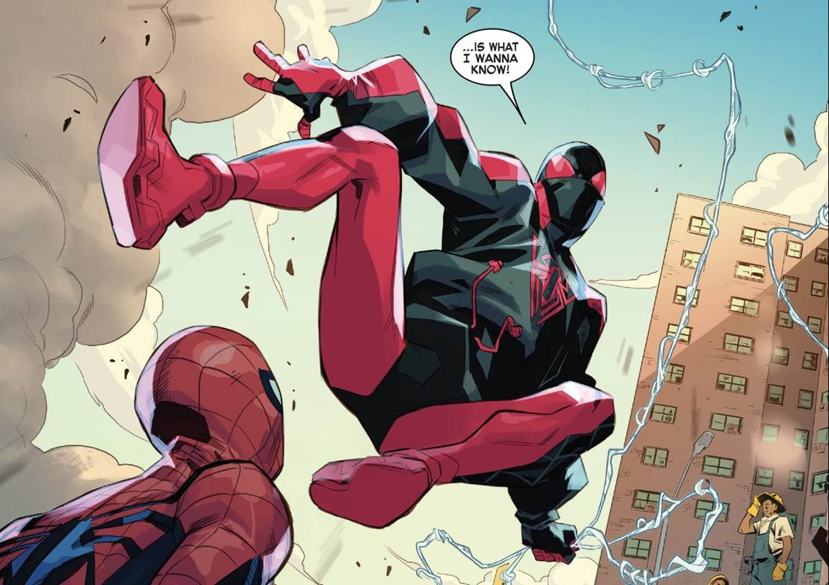 Miles Morales operates in Brooklyn and he’s had a long relationship with Peter Parker. So when he meets Spider-Man on the streets and hears a voice other than Peter’s you can bet he’s going to take issue with that. As the cover above implies, there is some conflict between these two Spider-Men.