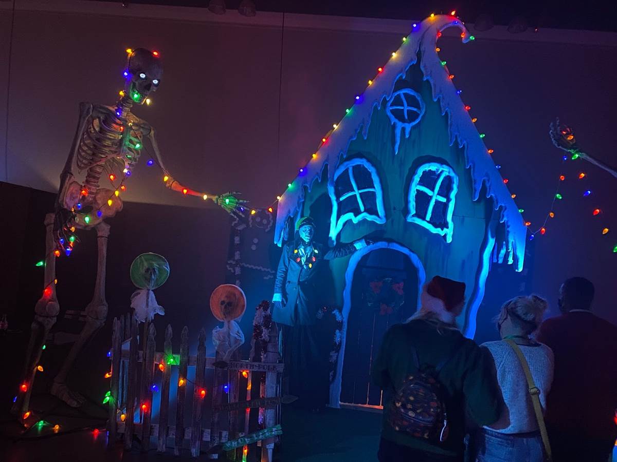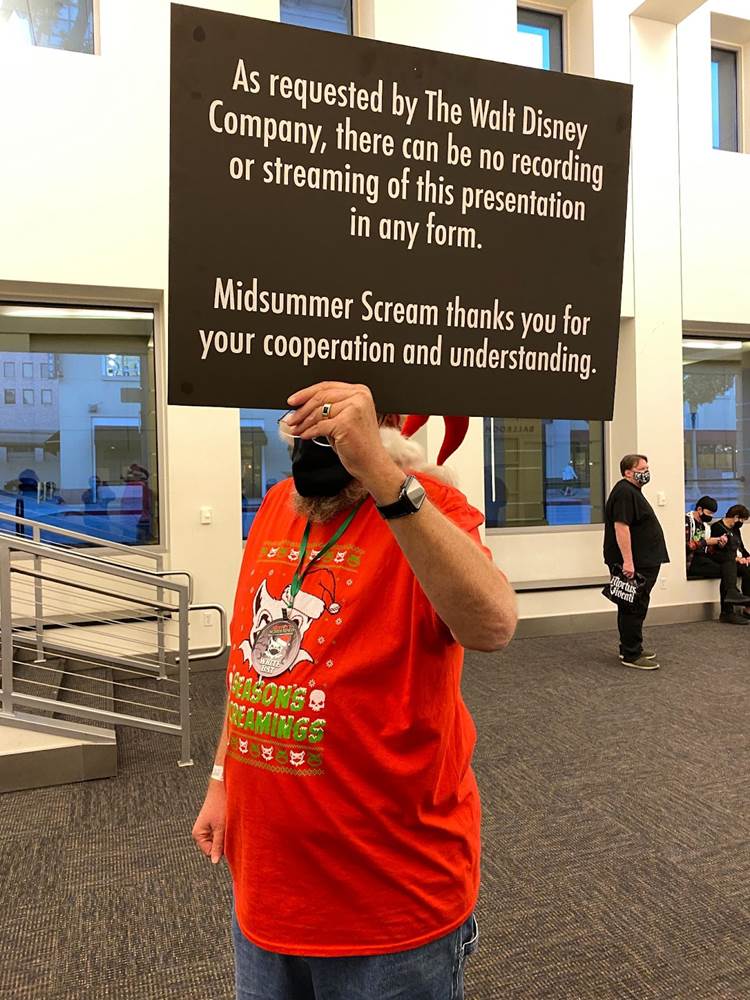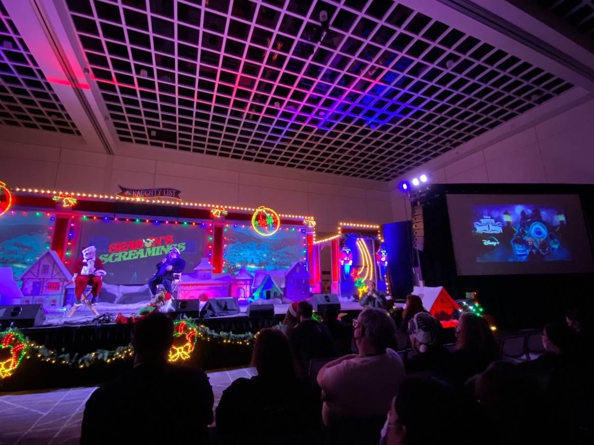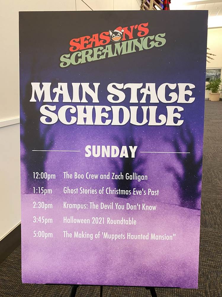 The last panel I attended on Sunday evening was “The Making of Muppets Haunted Mansion” featuring filmmaker Kirk Thatcher, who directed the hit Disney+ special that came out in October. While attendees weren’t allowed to shoot video of the presentation or take photos of Thatcher’s slideshow, I learned some very interesting pieces of information like the fact that Muppets Haunted Mansion was originally planned as a 90-minute made-for-Disney+ movie (though plans obviously changed after the pandemic hit) and that the song “Life Hereafter” performed in the mansion’s ballroom was once titled “Be Our Ghost” (but the Disney legal team wouldn’t clear the name). I also took note of the exceptional design that went into Season’s Screamings’ Main Stage, with some really cool-looking Christmas lights and other holiday decor.